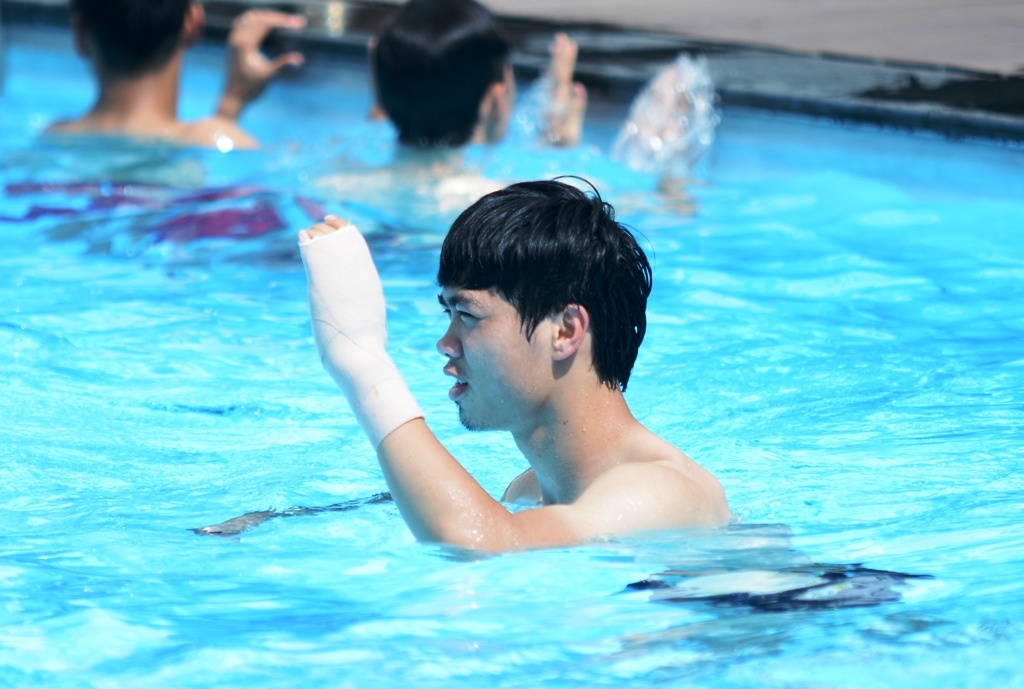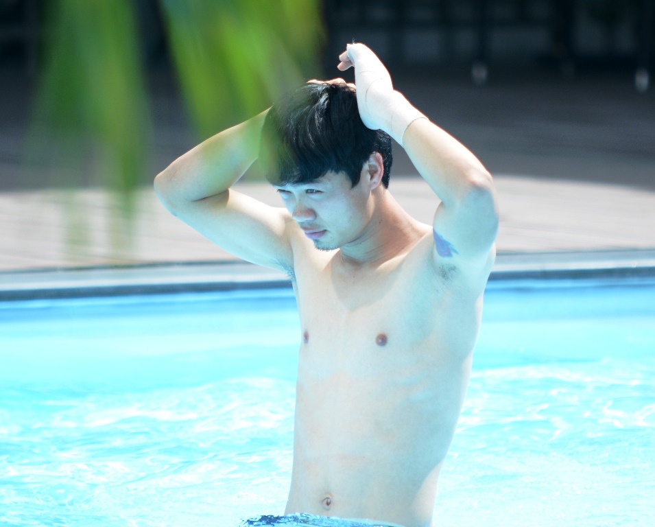 Tiền đạo trụ cột của U23 Việt Nam xuống bể bơi xả hơi cùng đồng đội nhưng anh không để cánh tay đang bó bột của mình nhiễm nước, tránh cho vết thương trầm trọng thêm.