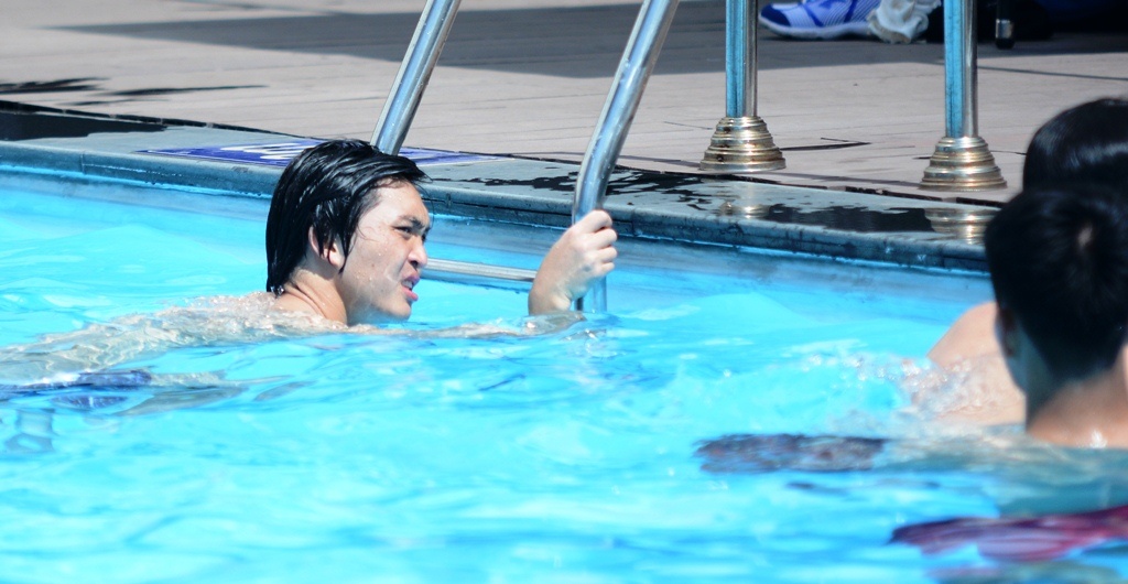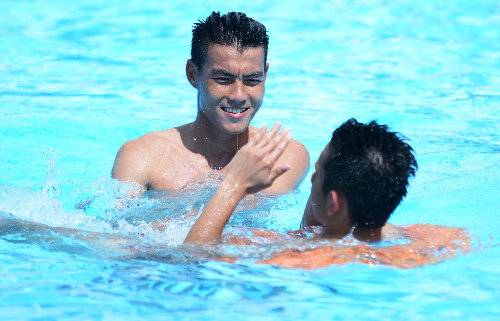 | Sau khi luyện thể lực với việc chạy 20 vòng sân dưới trời nắng nóng trưa 25/12, gần một nửa đội U23 Việt Nam đã xuống bể bơi tại khách sạn Becamex để tắm xả hơi. Công Phượng, Lê Thanh Bình, Phạm Hoàng Lâm, Phạm Xuân Mạnh, Nguyễn Phong Hồng Duy... nhanh chóng lao xuống nước để tắm. Sau đó, một số tuyển thủ khác như Lương Xuân Trường, Nguyễn Tuấn Anh, Nguyễn Nam Anh, Lâm Ti Phông... cũng tranh thủ thư giãn dưới nước. Điều này vừa giúp họ thoải mái tinh thần, vừa hồi phục thể lực. |