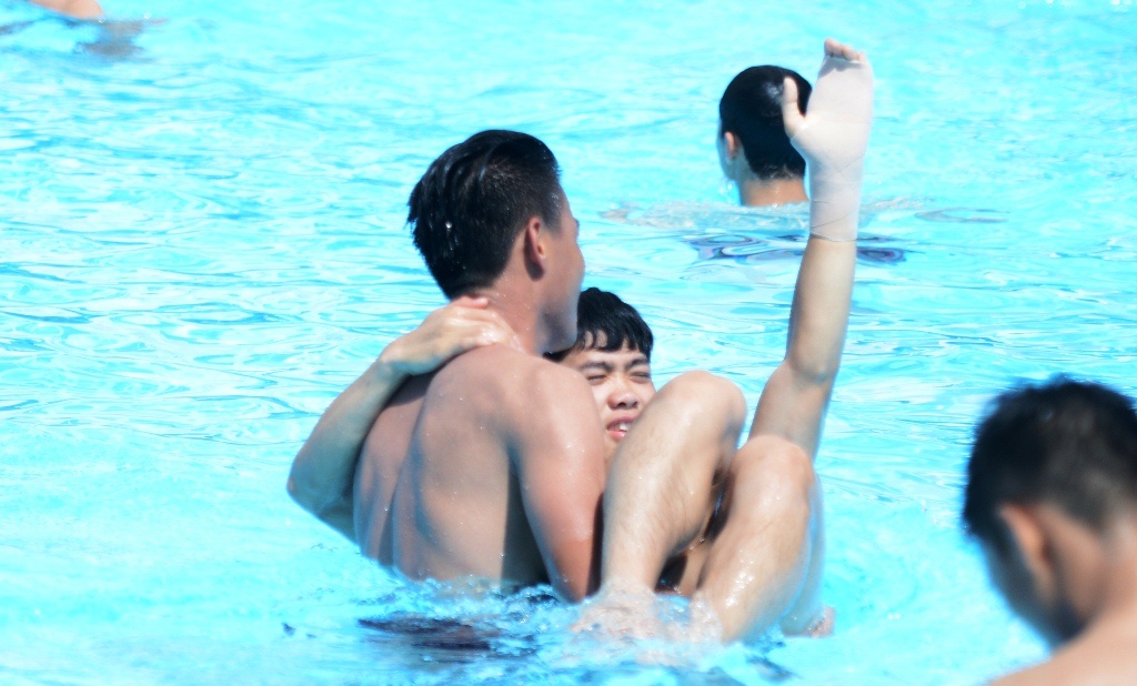 | Tiền đạo Lê Thanh Bình và trung vệ Nguyễn Nam Anh thi trò vật nhau tại bể bơi. Nam Anh (Hà Nội T&T) là cầu thủ được gọi bổ sung lên đội sau khi một loạt những ca chấn thương diễn ra tại U23 Việt Nam. |