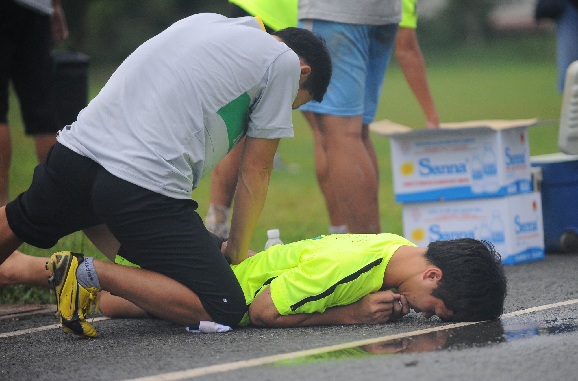 | Công Phượng chỉ chạy nhẹ vài bước rồi căng cơ dưới sự giúp đỡ của bác sĩ ngay trên mặt bê tông của sân QK9. |