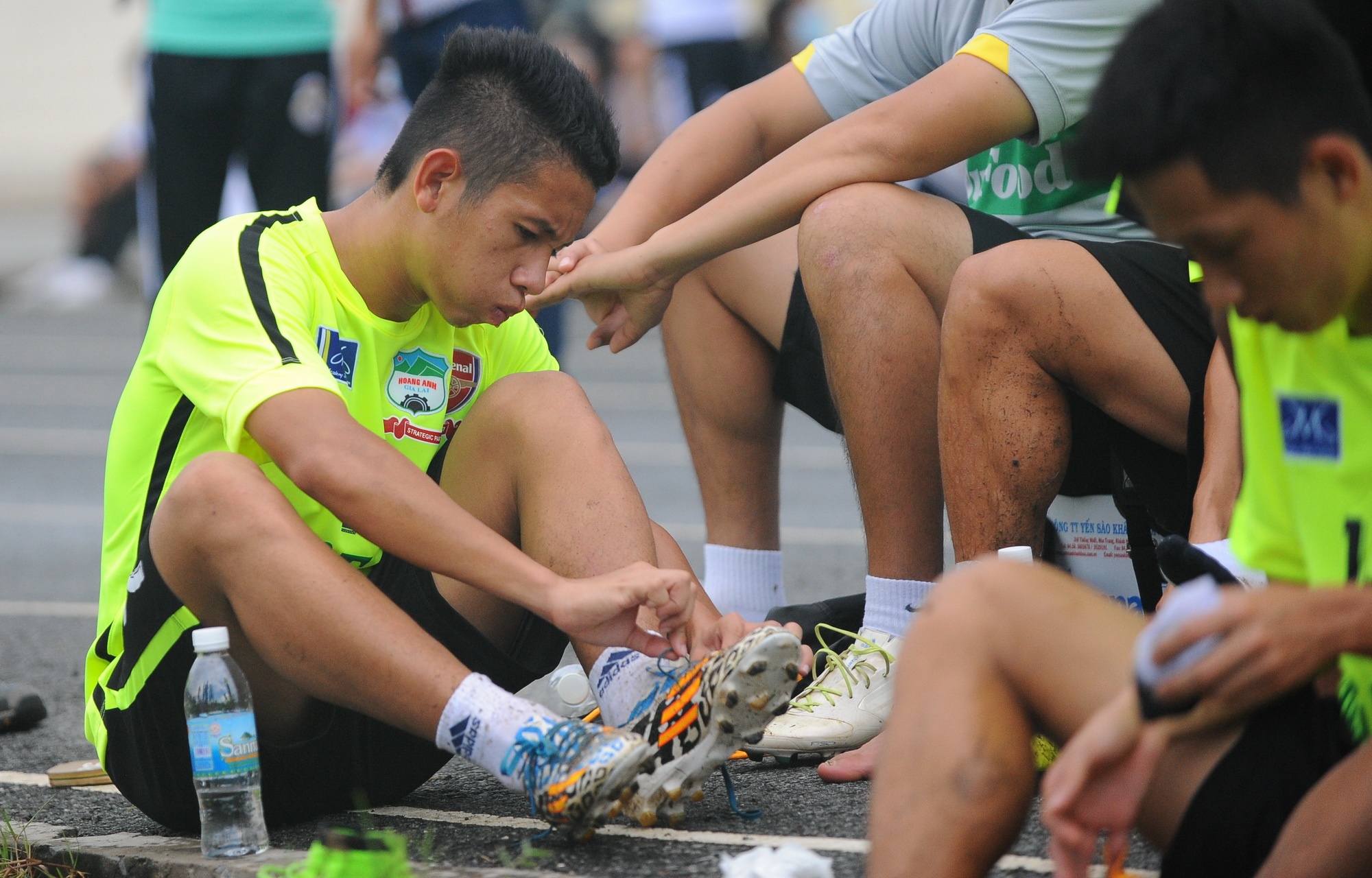 | Các cầu thủ U19 HAGL phải lau giày kỹ càng sau buổi tập vì sân quá bẩn. |