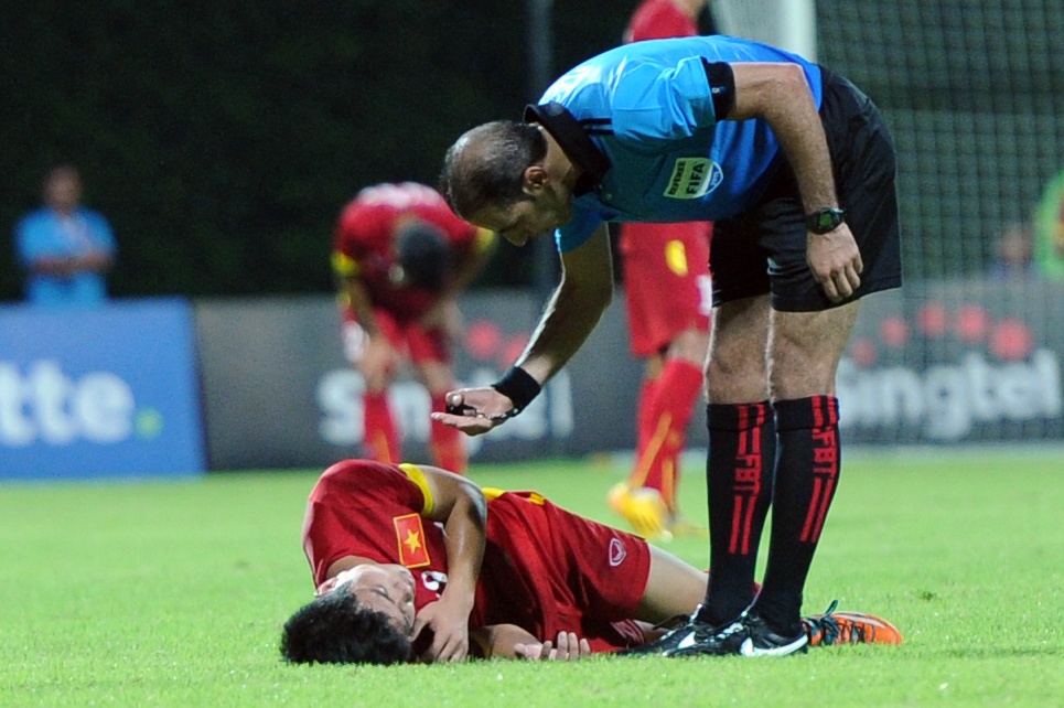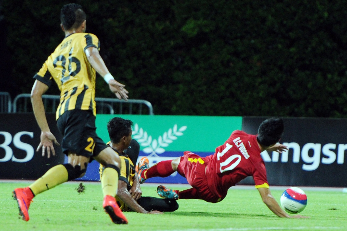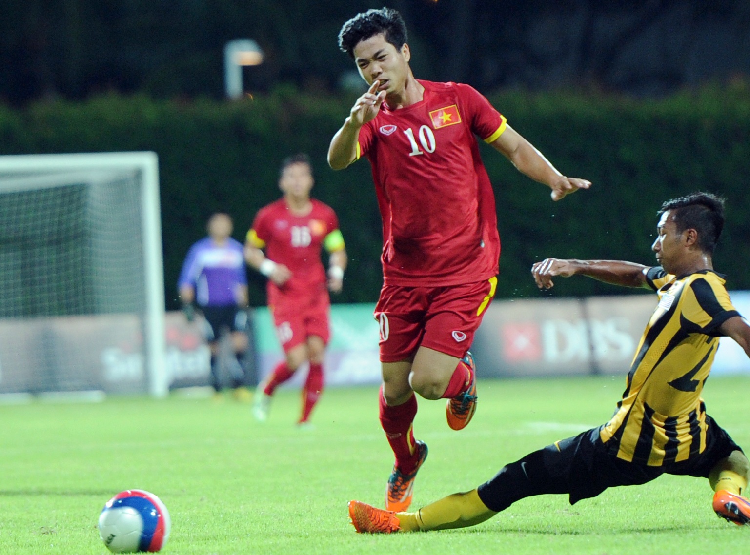 | Không ít lần chân sút xứ Nghệ nằm sân sau những cú vào bóng của hậu vệ Malaysia. Tuy nhiên, lối chơi rát của đối thủ không thể ngăn cản tinh thần thi đấu thăng hoa của Công Phượng. |
