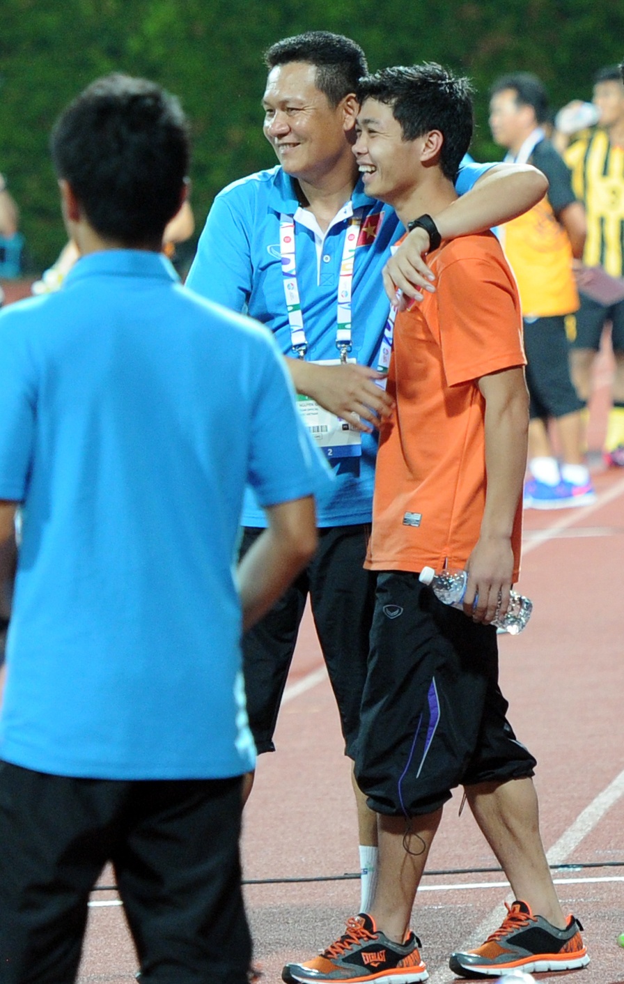 | Công Phượng nở nụ cười mãn nguyện khi U23 Việt Nam giành chiến thắng trước U23 Malaysia với tỷ số chung cuộc 5-1. Với kết quả này, U23 Việt Nam qua mặt U23 Thái Lan dẫn đầu bảng B khi cùng có 6 điểm nhưng hơn hiệu số bàn thắng bại. |