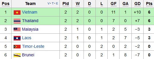 | Vị trí của các đội ở bảng B sau 2 lượt trận. U23 Việt Nam dẫn đầu với chiến thắng cùng hiệu số +10. |
