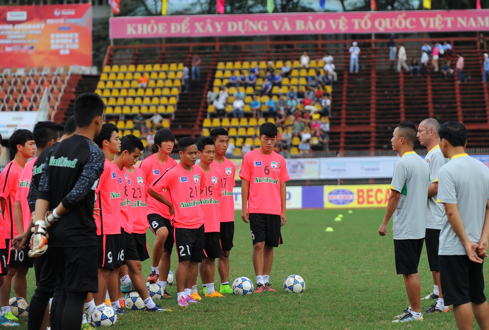 | Vị HLV trưởng người Pháp rất nghiêm khắc trong từng bài tập nhỏ của học trò. Ông cẩn thận uốn nắn từng động tác giữ thăng bằng cho các cầu thủ trẻ. |