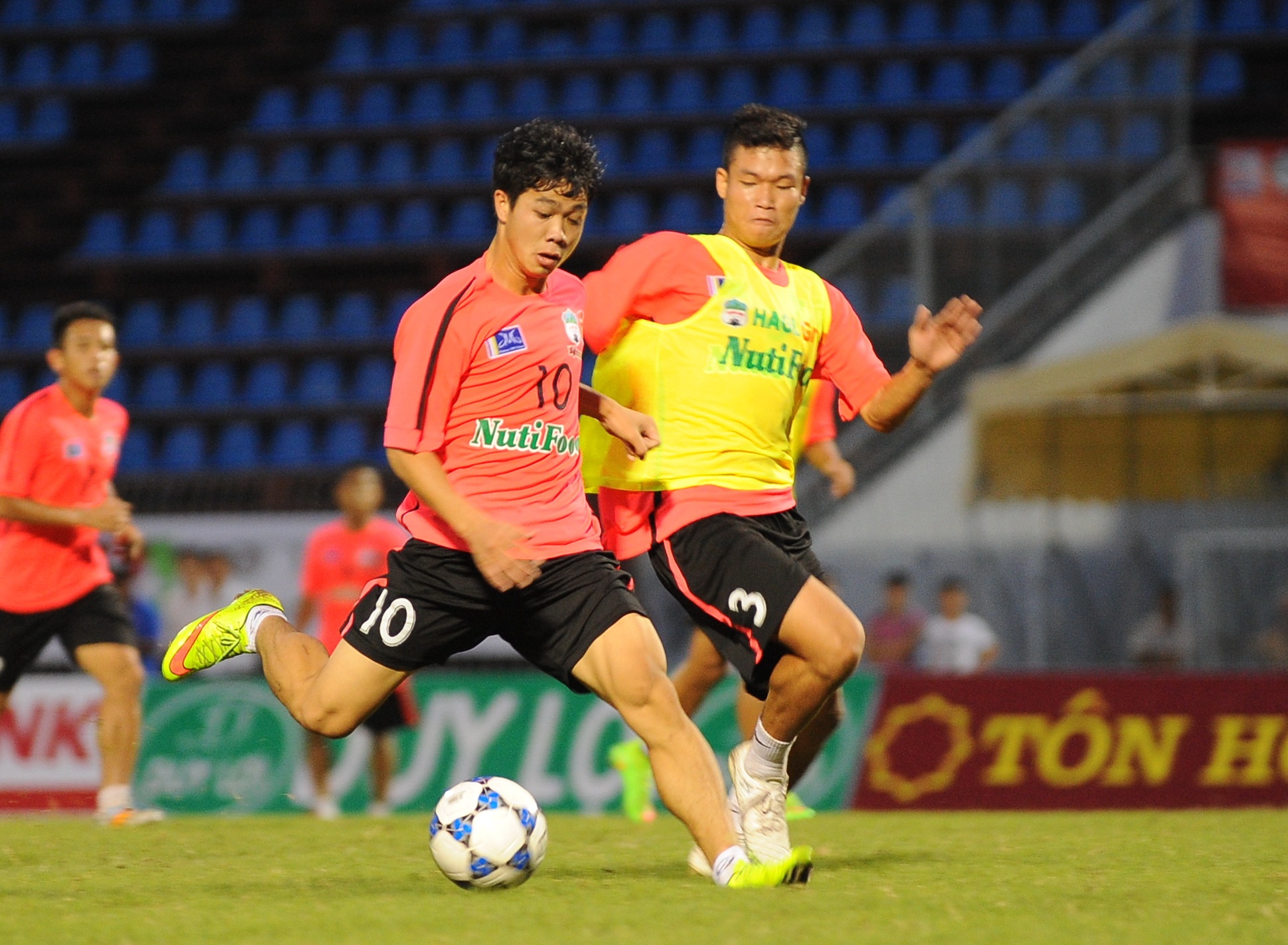 | Đội hình chính sẽ đá trận đấu ngày mai (áo hồng) sẽ gồm: Văn Tiến (thủ môn), Văn Sơn, Ksor Úc, Tiến Dũng, Đức Lương, Thanh Tùng, Xuân Trường, Tuấn Anh, Hồng Duy, Công Phượng, Văn Toàn. |