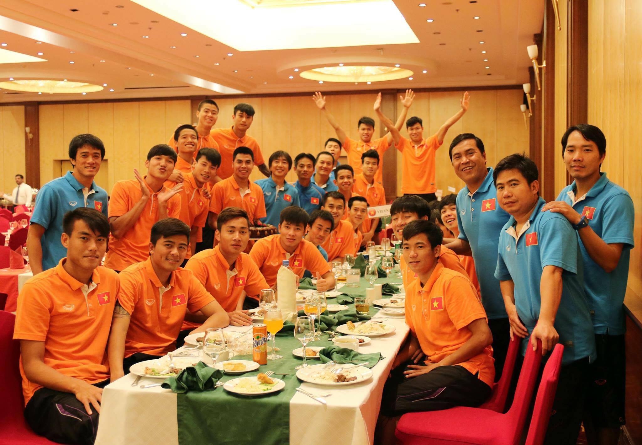| Bữa trưa vui vẻ của toàn đội U23 Việt Nam nhân dịp sinh nhật Công Phượng, Đức Huy. Ảnh: Tuấn Anh |