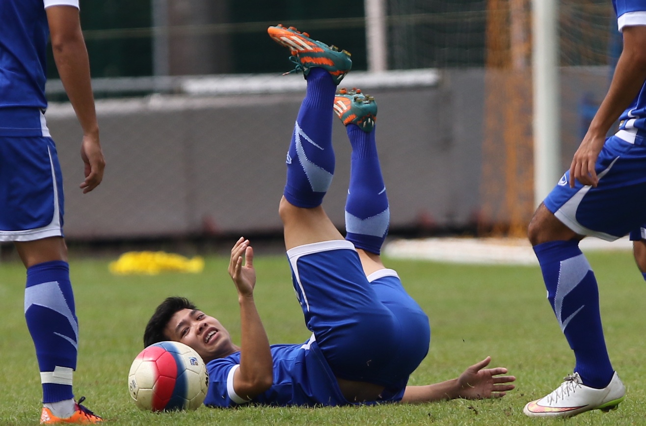 | Công Phượng trong một tình huống cản phá bóng bị ngã bổ nhào xuống sân tập. |