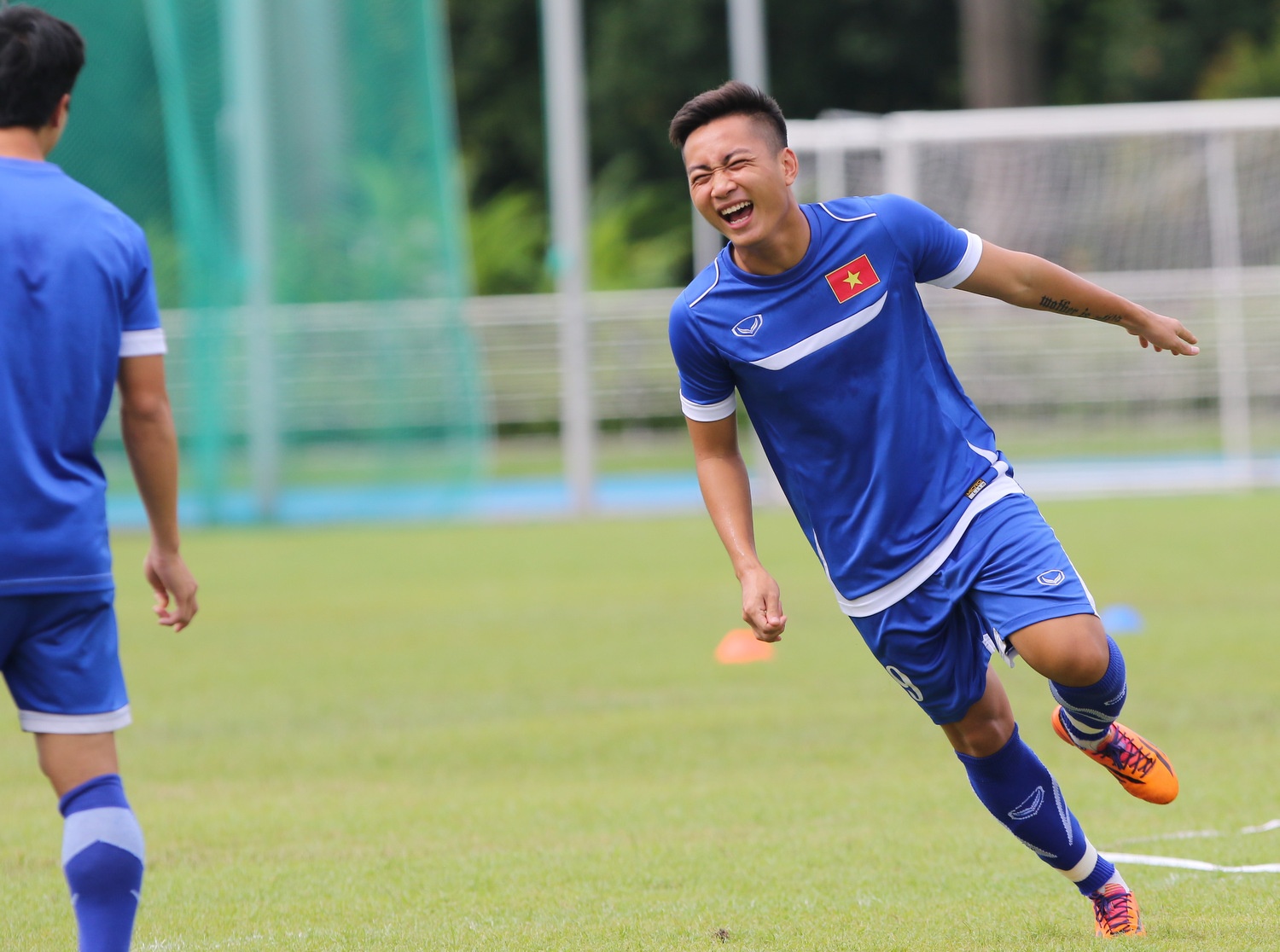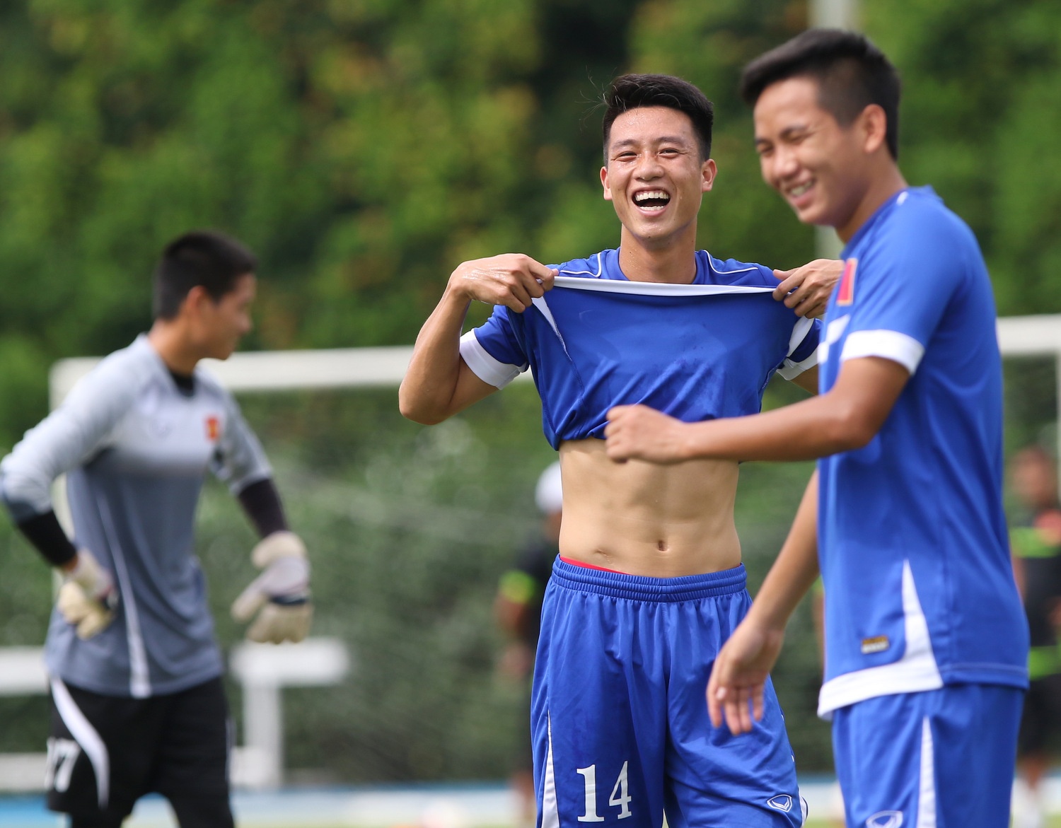 | Tuấn Tài cười sảng khoải "chọc" tiền đạo đồng hương Nghệ An. |
