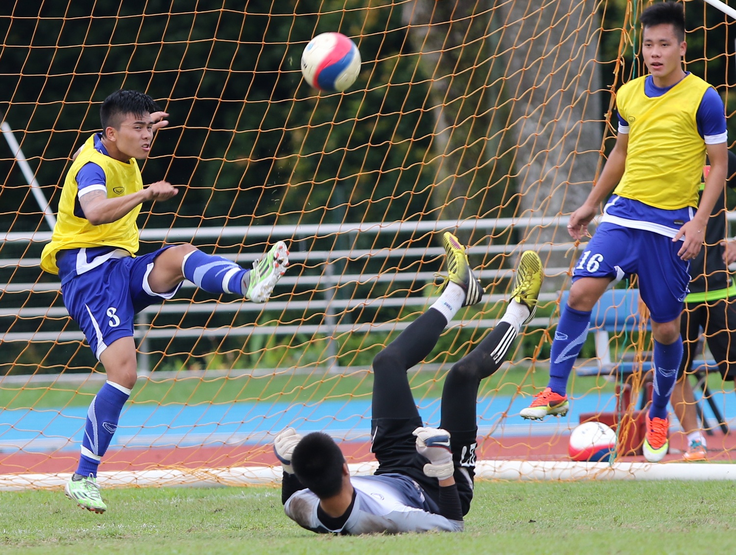 | Sau đó, hàng tiền vệ, tiền đạo U23 Việt Nam tìm cách tạo đột biến và ghi bàn. Ngọc Thắng quyết đoán bắt bóng sống và ghi bàn trên sân tập. |