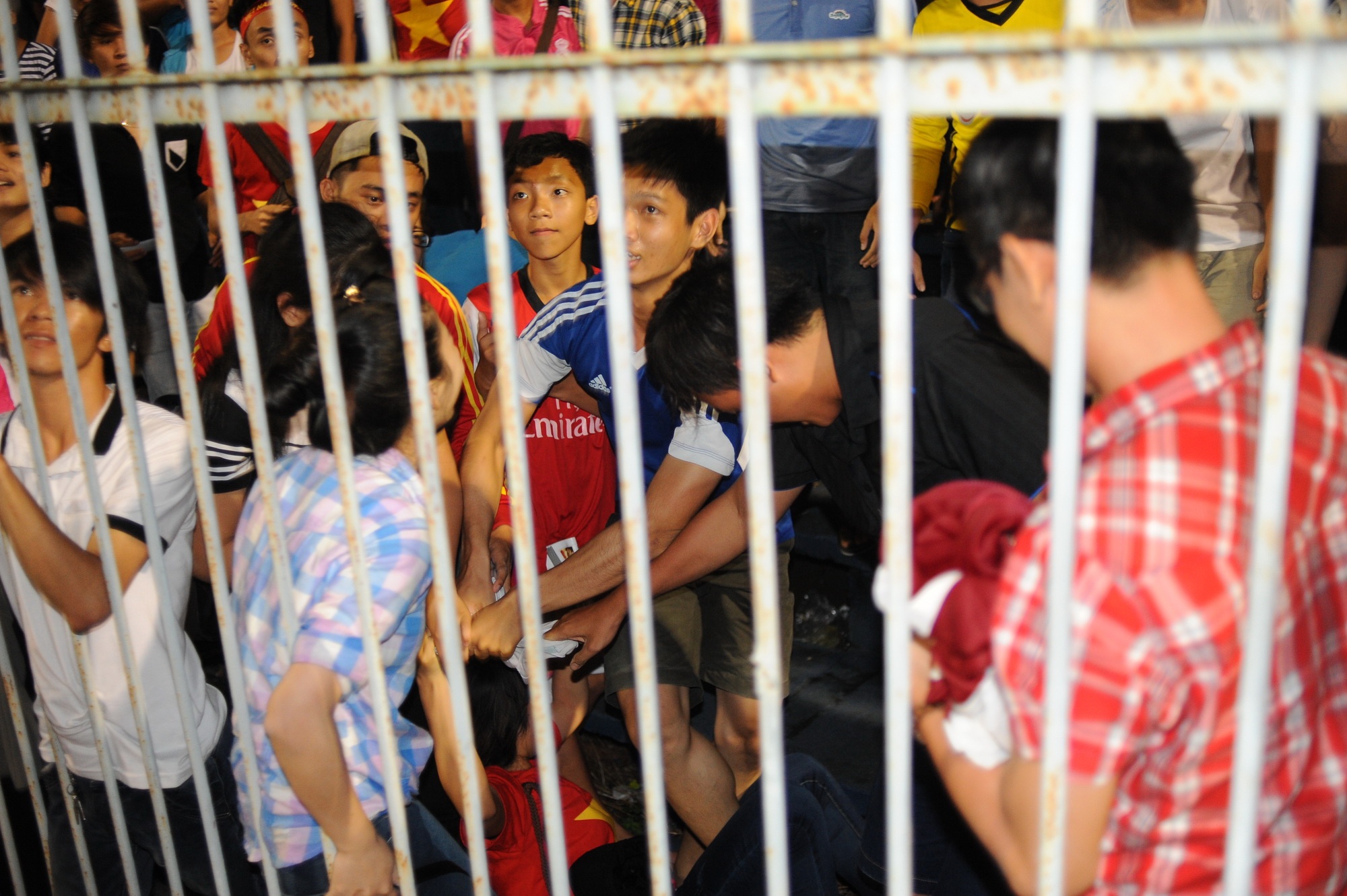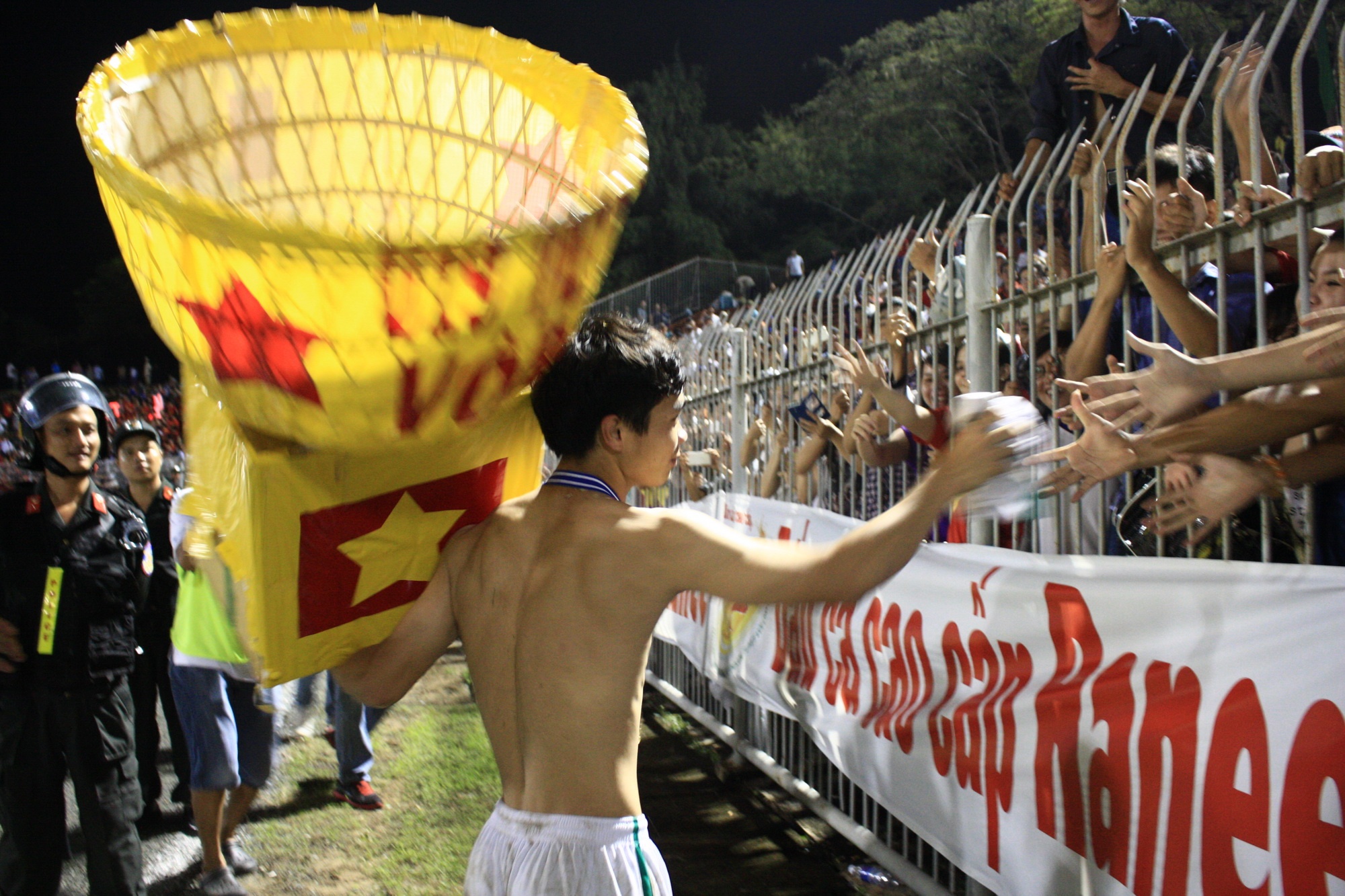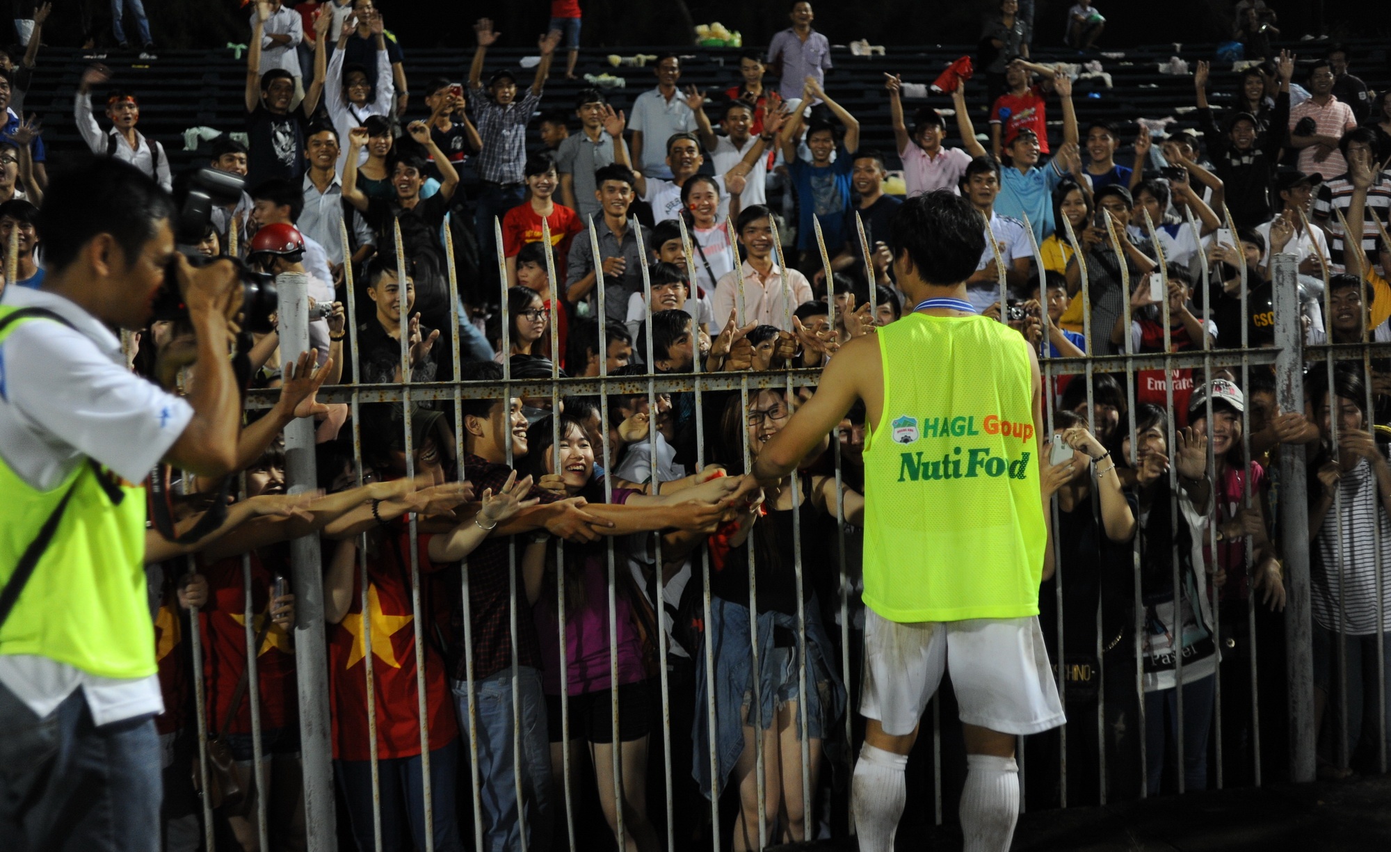 | Khán giả tràn xuống hàng rào sắt để được 1 lần chạm tay tiền đạo đội trưởng của U19 HAGl cũng như U19 Việt Nam trong thời gian qua. |