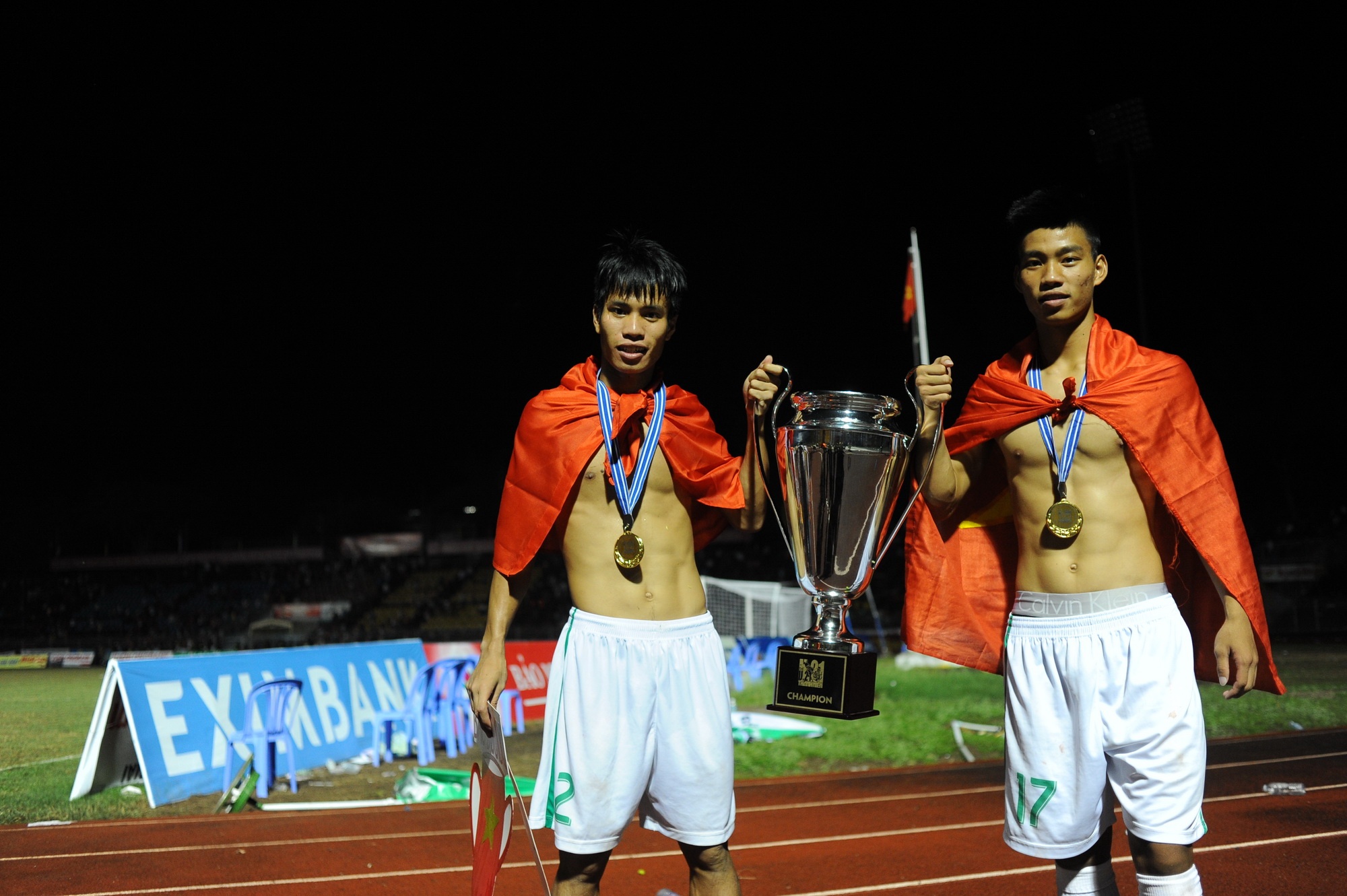 | Công Phượng cùng đồng đội trên bục trao giải vô địch. Đây là thời điểm duy nhất Phượng nâng cao chiếc Cup lần đầu tiên trong đời. |