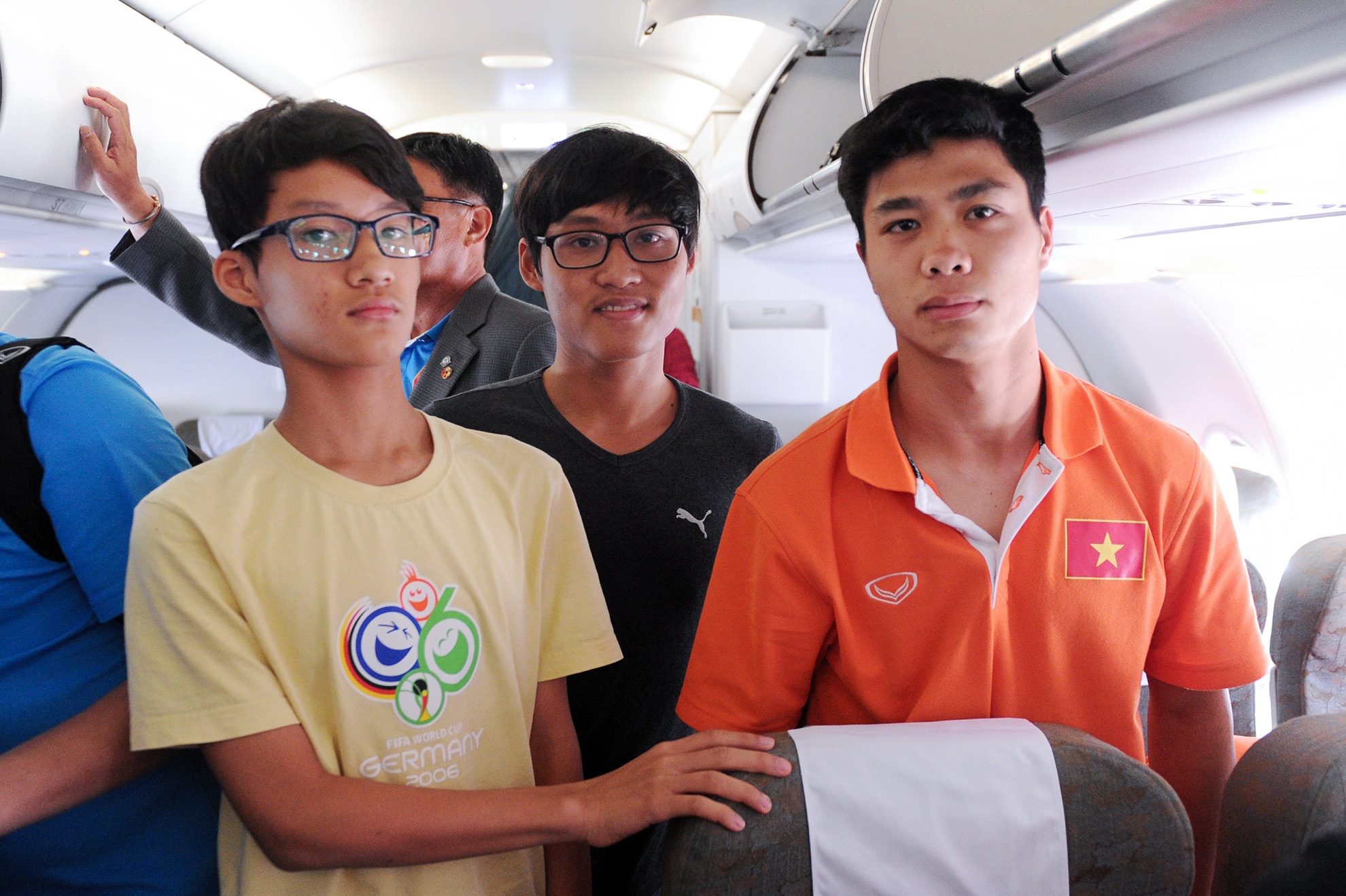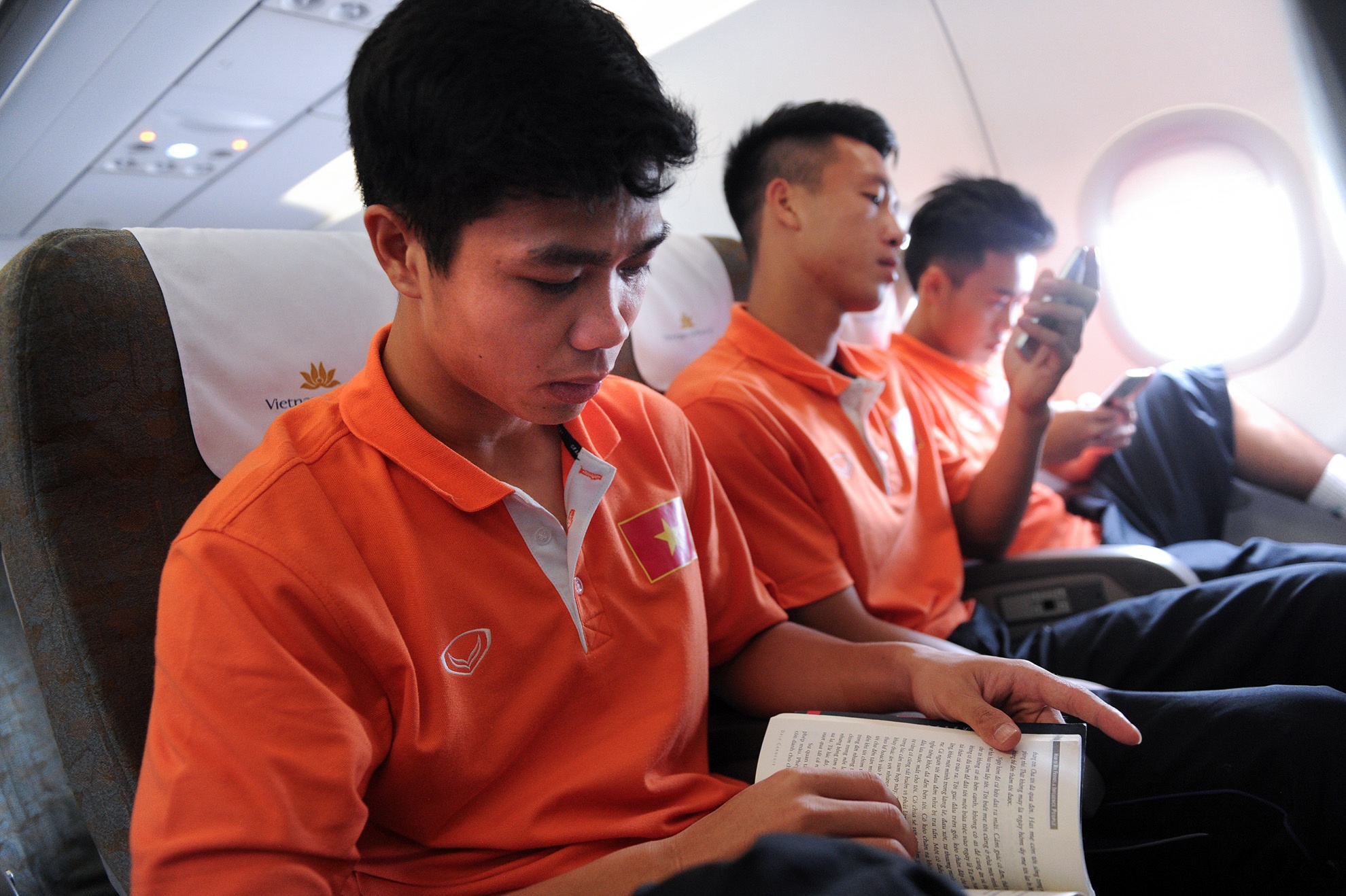 | Tâm lý các cầu thủ U23 Việt Nam khá thoải mái khi lên máy bay đi Singapore. Công Phượng lựa chọn sách để đọc trong thời gian bay kéo dài 3 tiếng đồng hồ. |