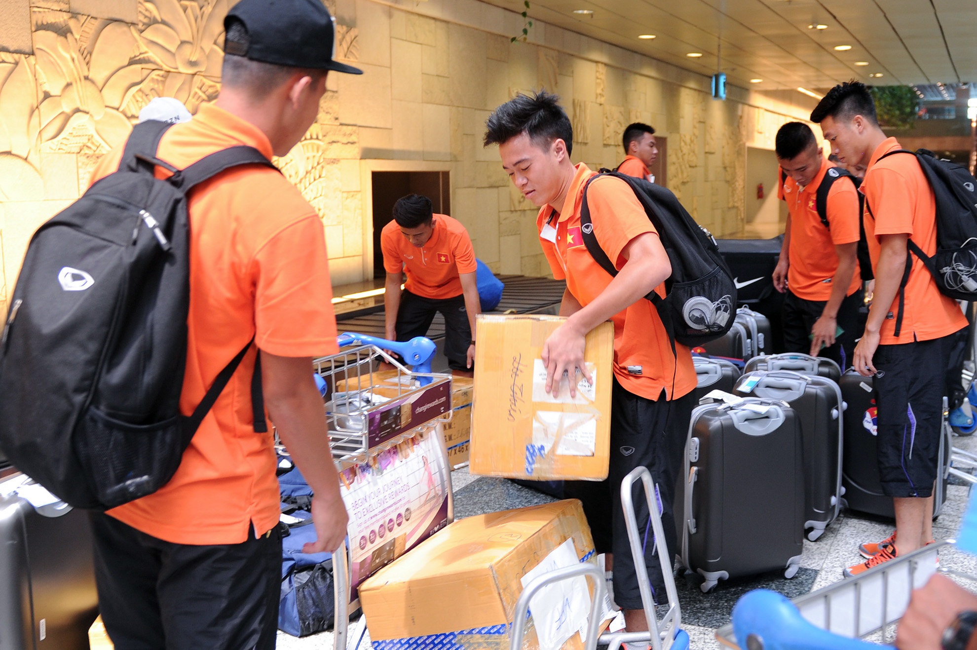 | Các cầu thủ nhận hành lý, chuẩn bị về khách sạn. |