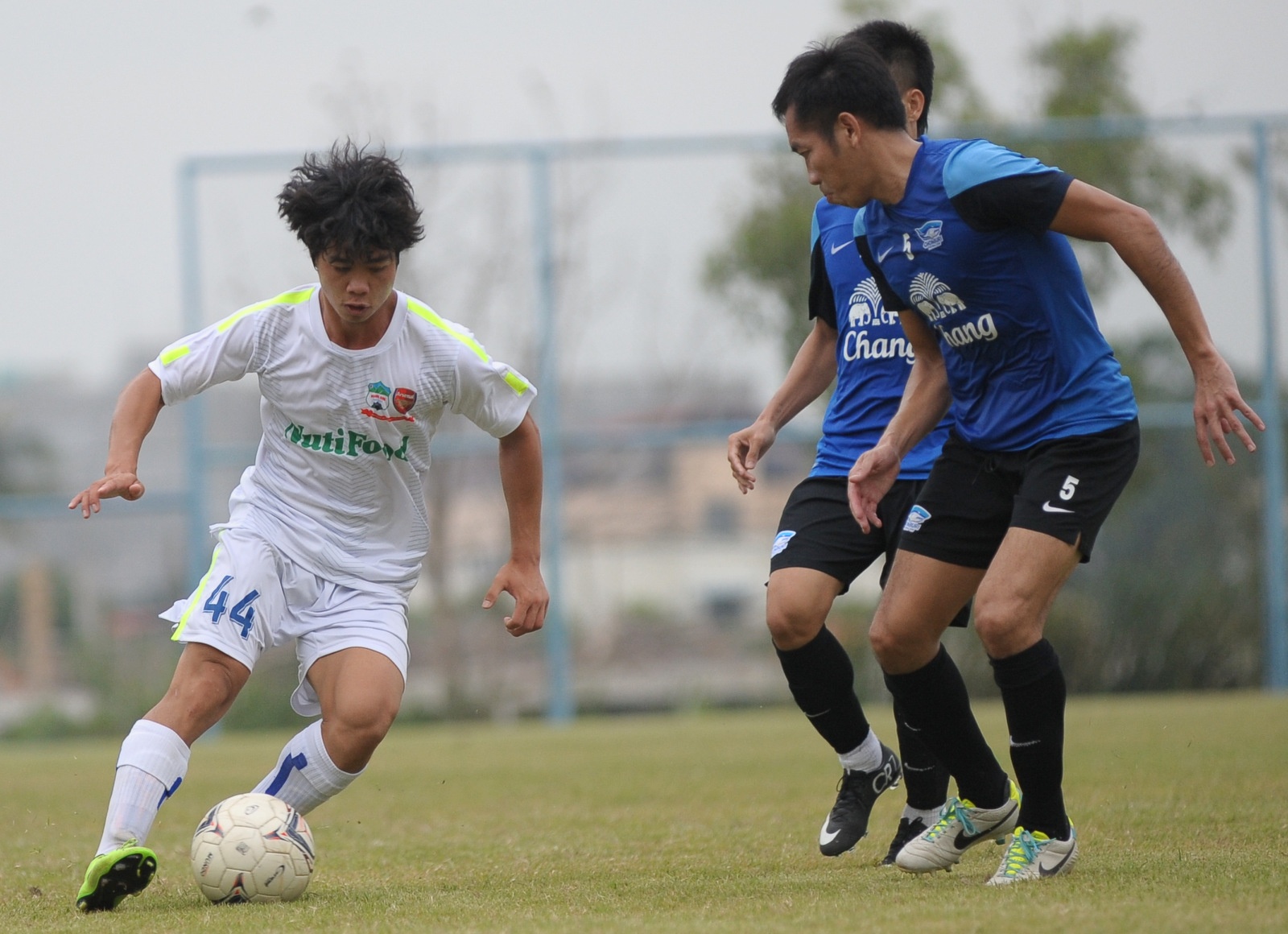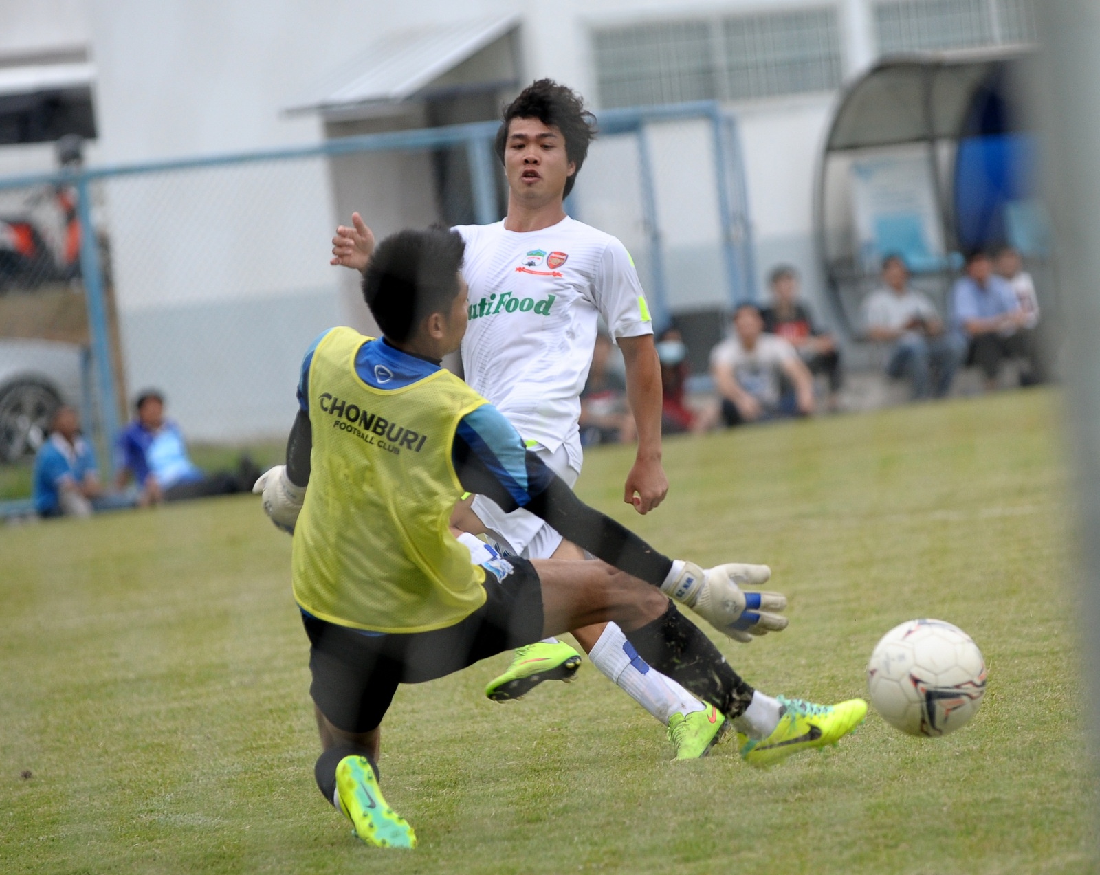 | Công Phượng trong một tình huống dứt điểm hạ gục thủ môn đối phương trong trận CLB HAGL thắng Chonburi FC 3-0. |