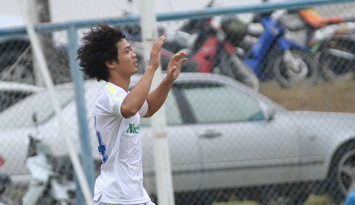 | Tiền đạo mang áo số 44 chạy đến ăn mừng cùng đồng đội sau pha ghi bàn. Nhiều cầu thủ ở đội HAGL nói vui nhìn mái tóc Công Phượng như chiếc bờm của chú sư tử dũng mãnh. |
