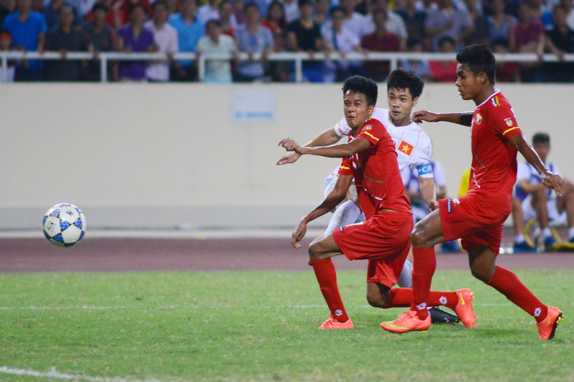 Hàng phòng ngự của U19 Myanmar liên tục hứng chịu sức ép khủng khiếp từ những pha lên bóng của đội chủ nhà.