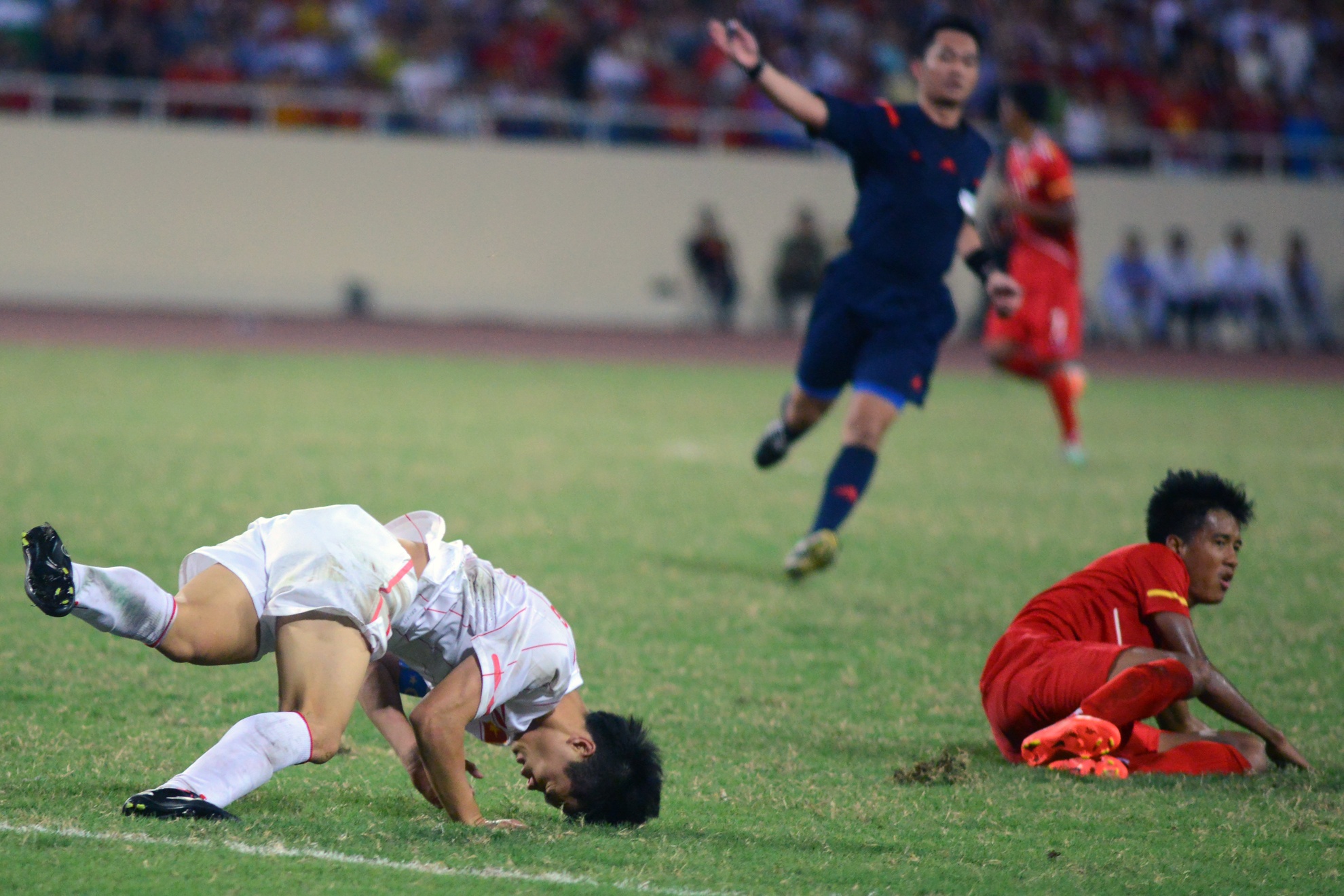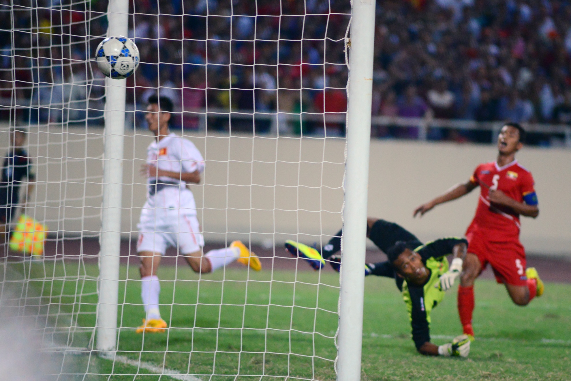 | Một pha dứt điểm không thành, anh đã ngã lăn quay ngay trước cầu môn của thủ thành Myo Min Latt. |