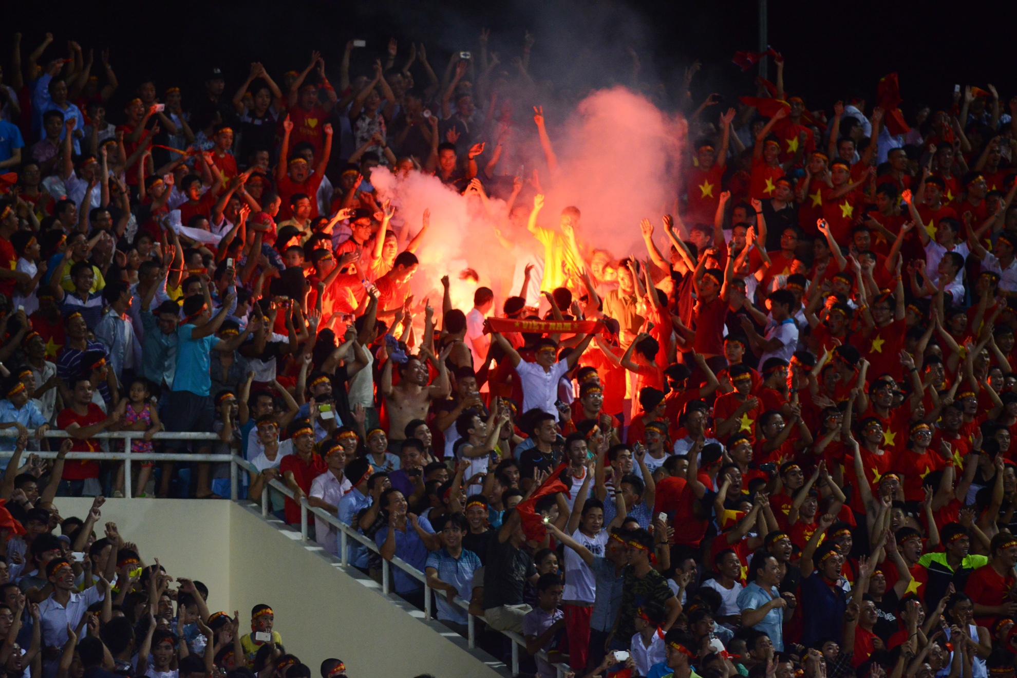 | Các cổ động viên liên tục được đốt pháo sáng ăn mừng trên khán đài. |