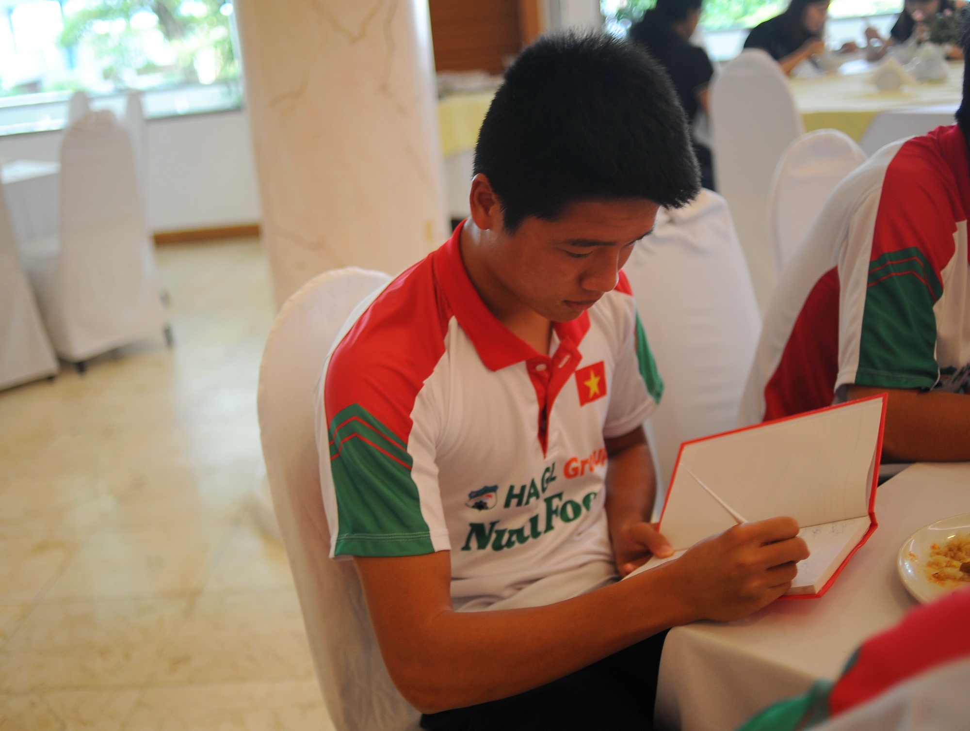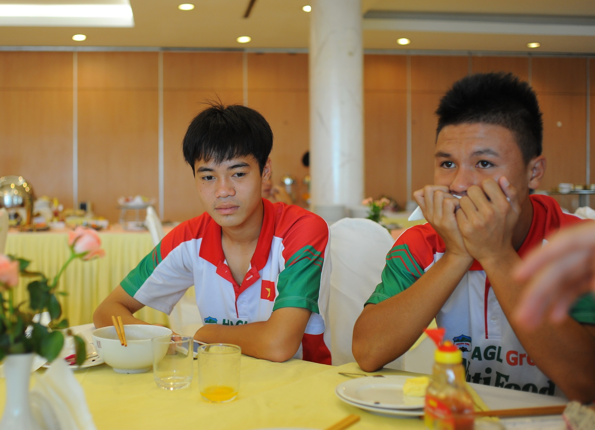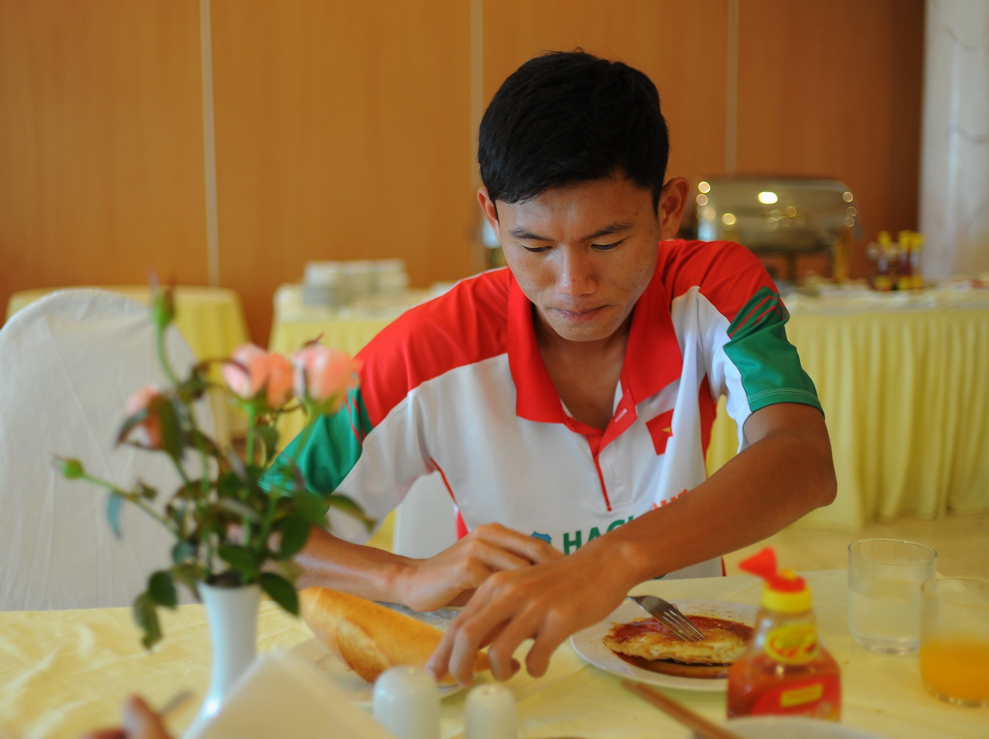 | Tiền đạo Văn Toàn tỏ ra khá mệt trong bữa ăn sáng khi thi đấu gần trọn vẹn 90 phút và ghi được 1 bàn thắng ở trận bán kết. |