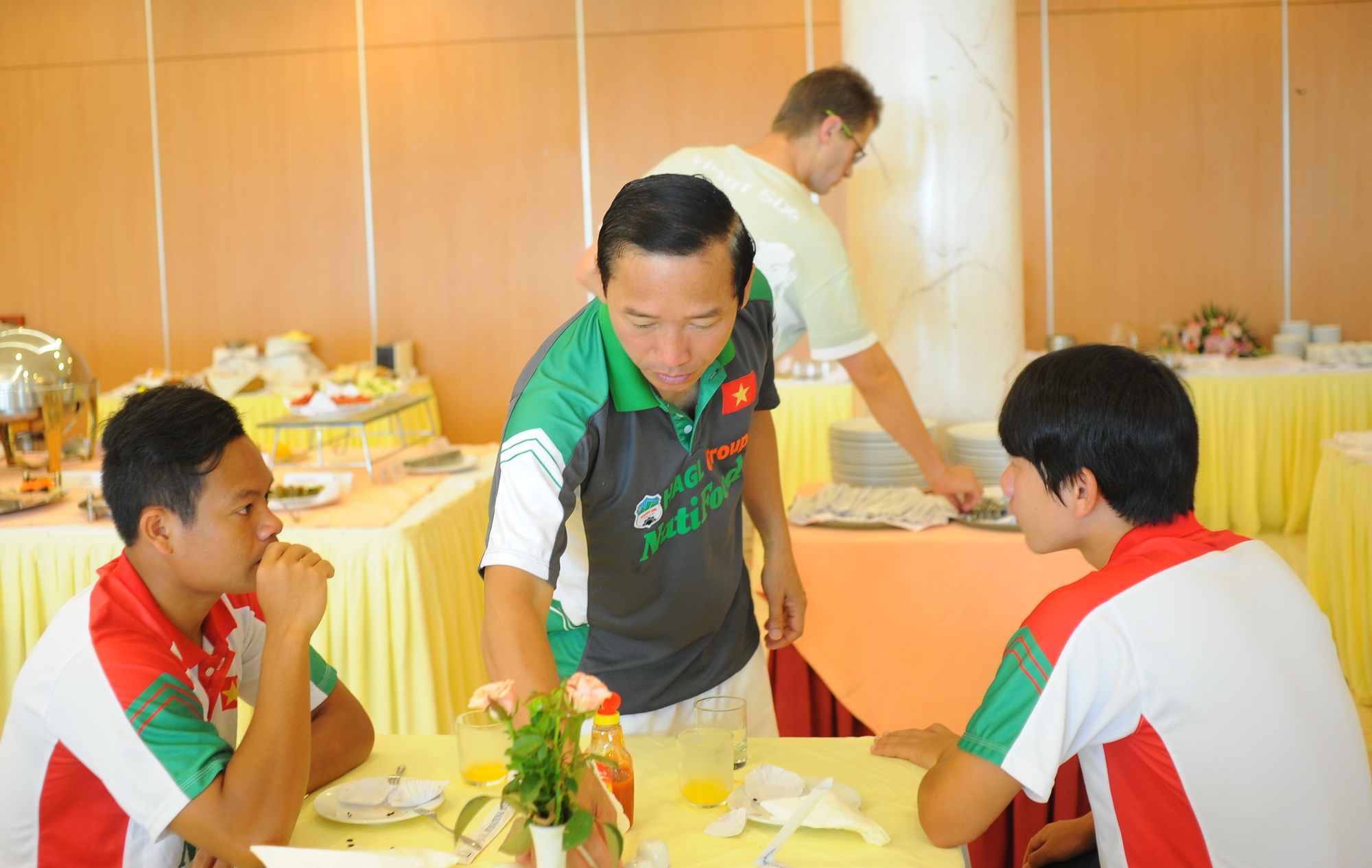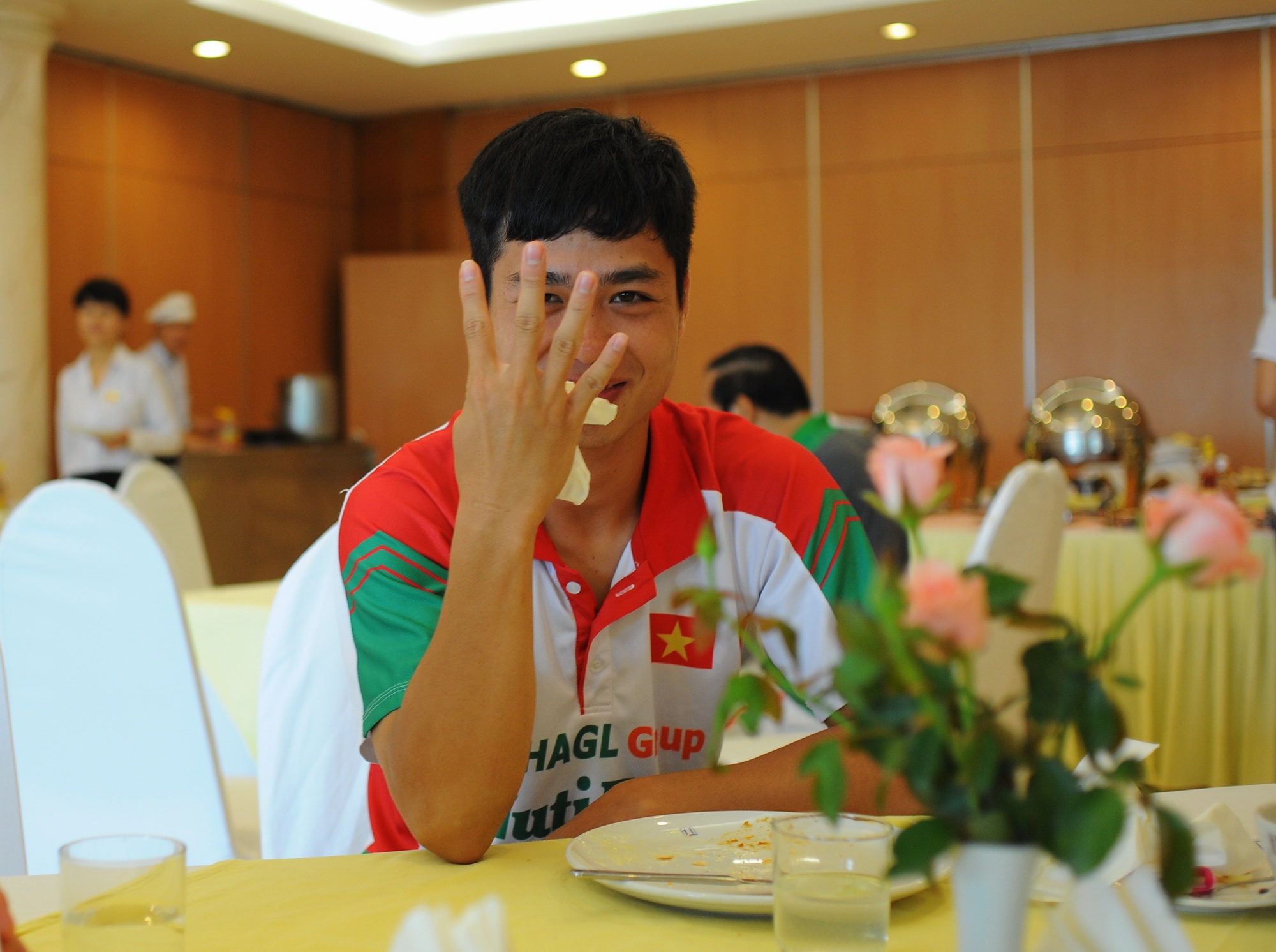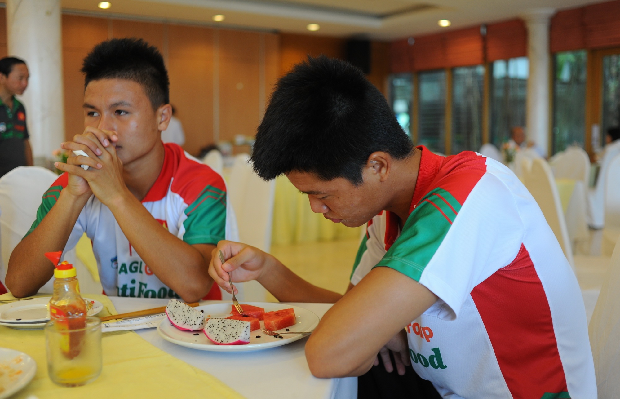 | Tiền đạo Văn Toàn tỏ ra khá mệt trong bữa ăn sáng khi thi đấu gần trọn vẹn 90 phút và ghi được 1 bàn thắng ở trận bán kết. |