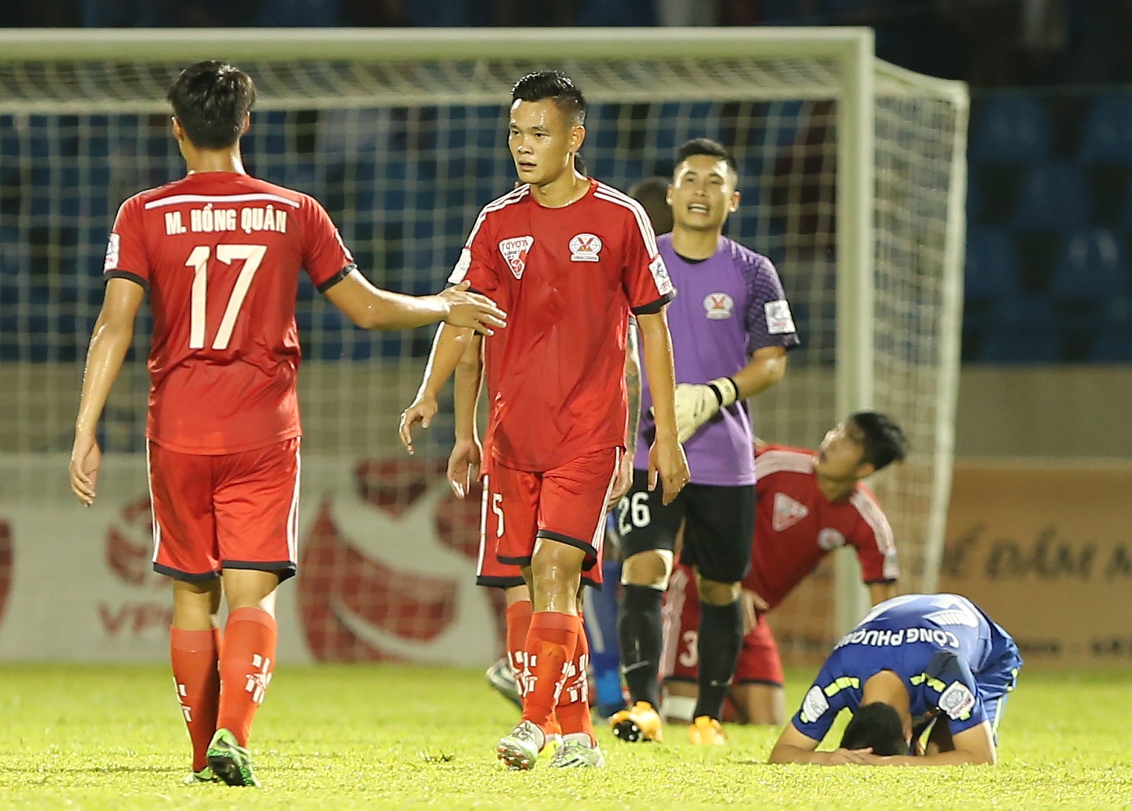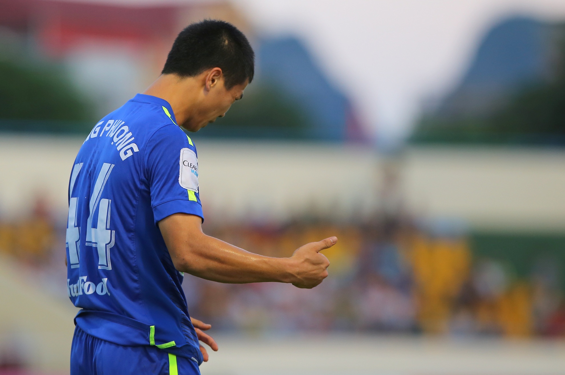 | Sau khi trọng tài Phùng Đình Dũng thổi hồi còi kết thúc trận đấu muộn ở vòng 19 V.League 2015, Công Phượng nằm gục xuống sân trong khi Mạc Hồng Quân chạy về phía các đồng đội chia sẻ niềm vui chiến thắng. Cùng là cặp tiền đạo U23 Việt Nam, Mạc Hồng Quân với sự hỗ trợ từ các đồng đội có cú đúp trong chiến thắng 3-0 của đội nhà. |