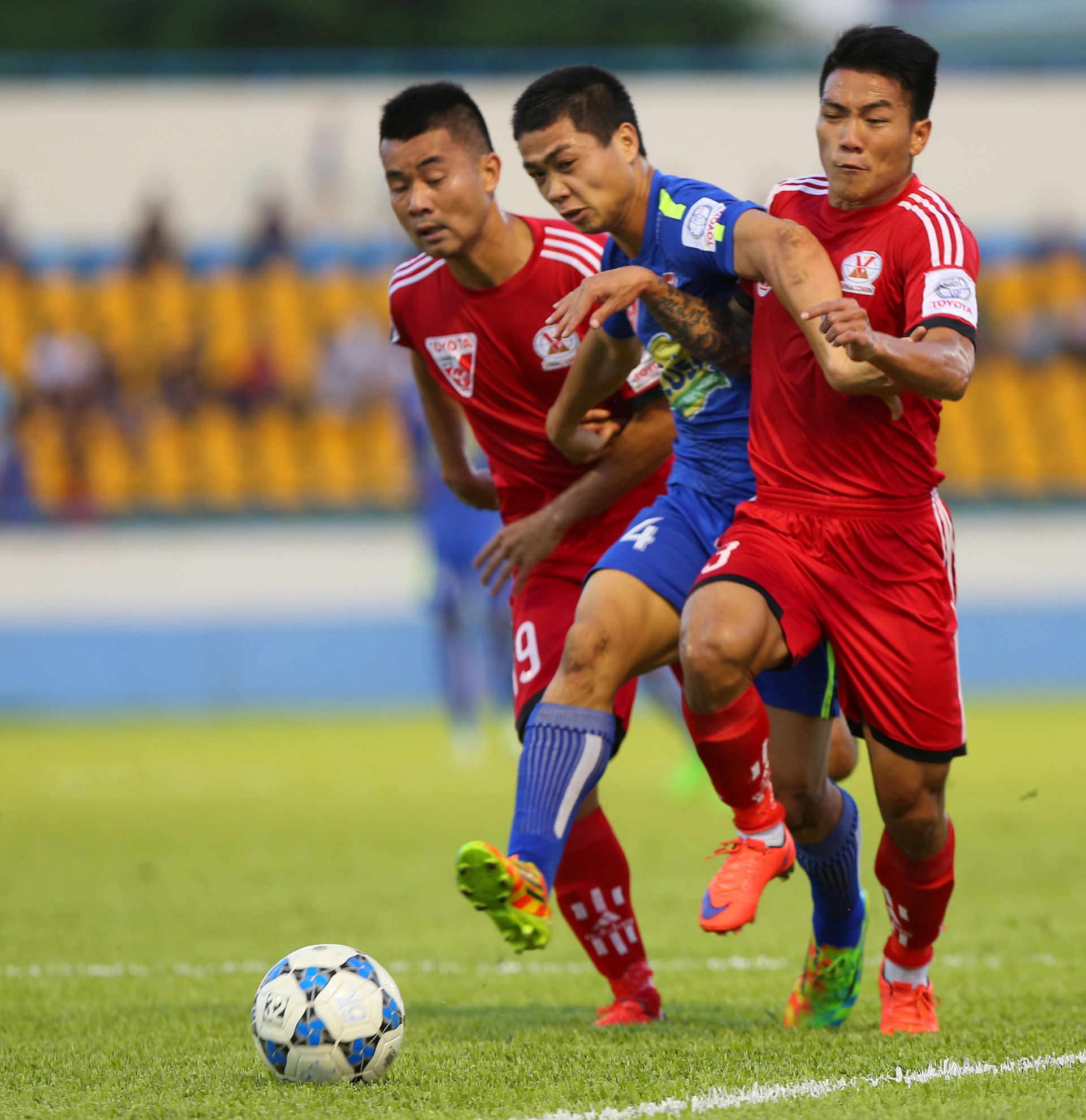 | Tiền vệ Tuấn Anh lép vế trước lối chơi quyết liệt và đầy kinh nghiệm của những Hải Huy, Minh Tuấn... |