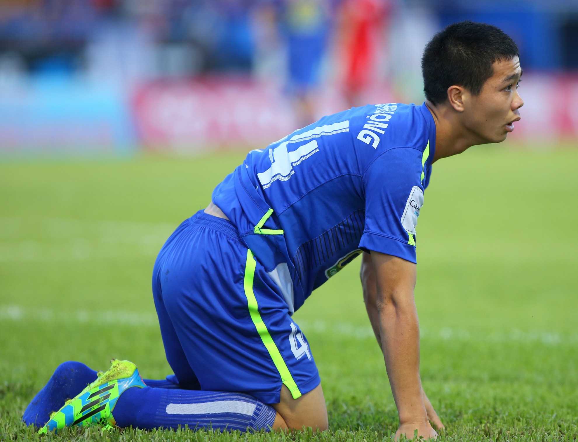 Công Phượng nằm gục xuống cỏ sau trận thua trên sân Cẩm Phả