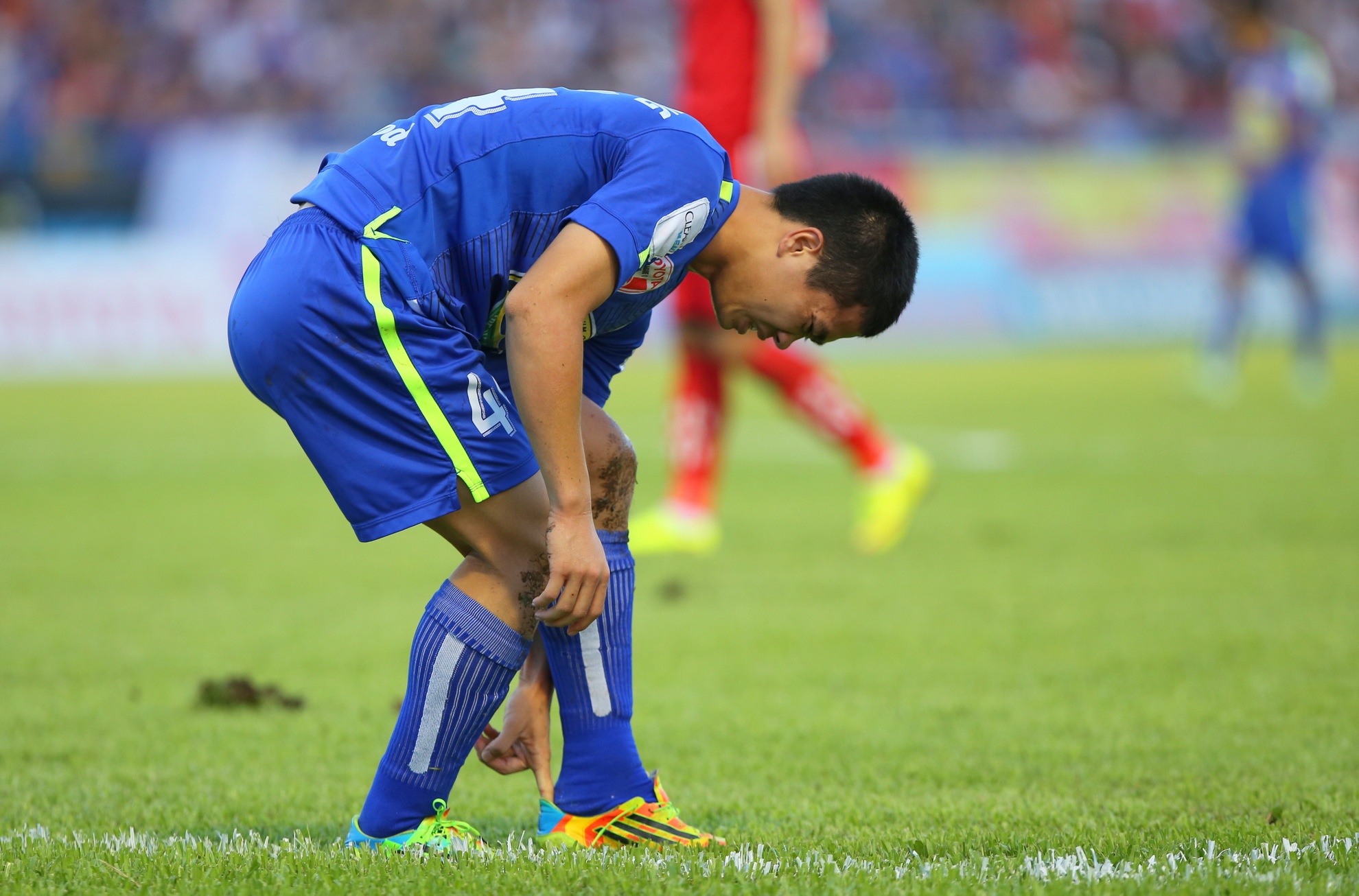 | Trong tình huống tranh bóng quyết liệt kể trên, Công Phượng vừa đau vừa bị tuột chiếc giày chân trái. |