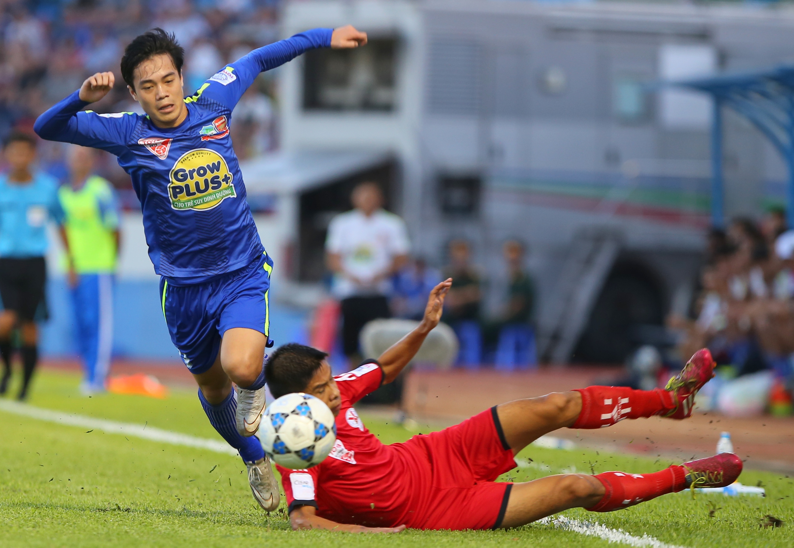 | Tiền đạo người Nghệ An luôn bị theo kèm chặt mỗi khi có bóng. Trong một tình huống ở nửa đầu hiệp 1, đàn anh Quảng Hải lùi về hỗ trợ trung vệ Hoàng Tuấn Anh vô hiệu hóa pha đi bóng trong khu vực 16,5 m của Công Phượng. |
