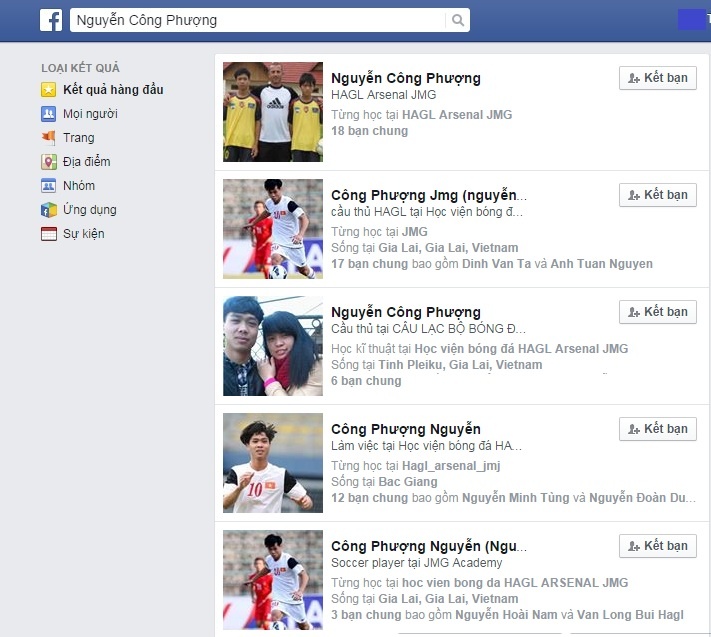 | Khi tìm kiếm trên Facebook, hàng loạt trang cá nhân giả mạo Nguyễn Công Phượng xuất hiện. |