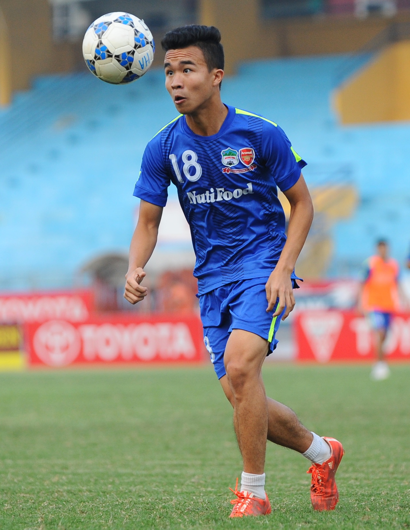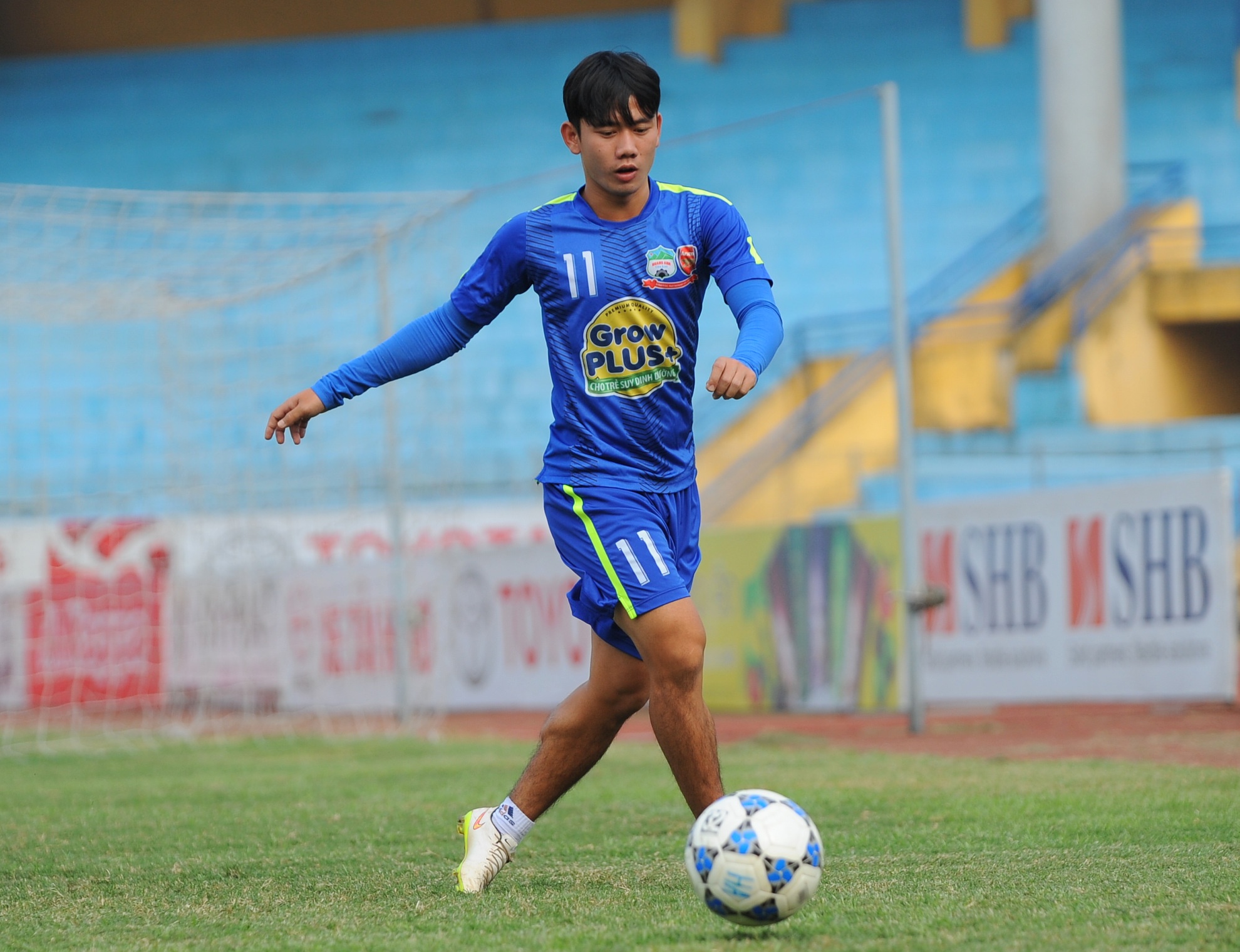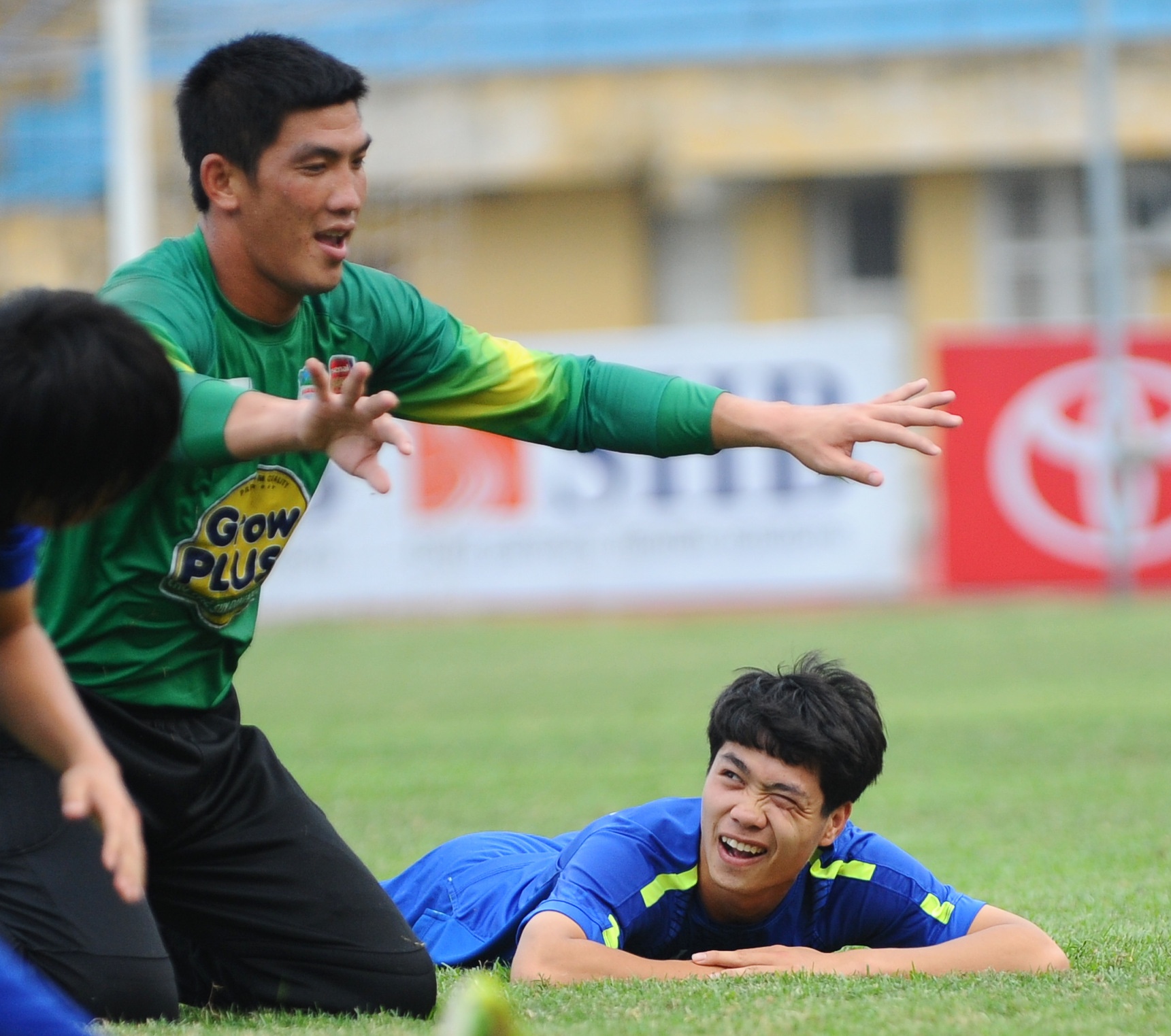 | Tiền đạo quê Nghệ An cười tinh nghịch khi nhìn đồng đội cố gắng tập luyện. |