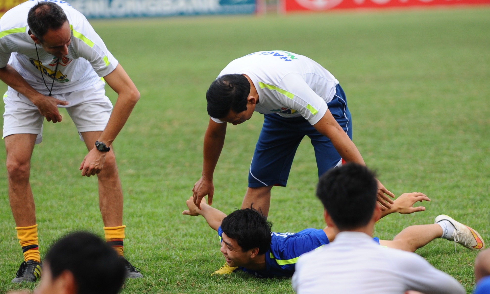 | Bác sĩ Đồng Xuân Lâm và HLV thể Lực Anthony Debant giúp Công Phượng căng cơ sau bài tập. |
