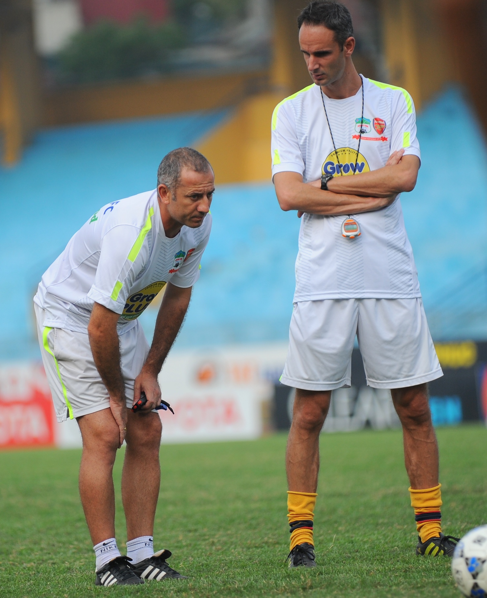| Sau phẫu thuật chữa chấn thương dây chằng, HLV Graechen đã có thể bỏ nẹp đầu gối và ra sân chỉ đạo các học trò tập luyện. |