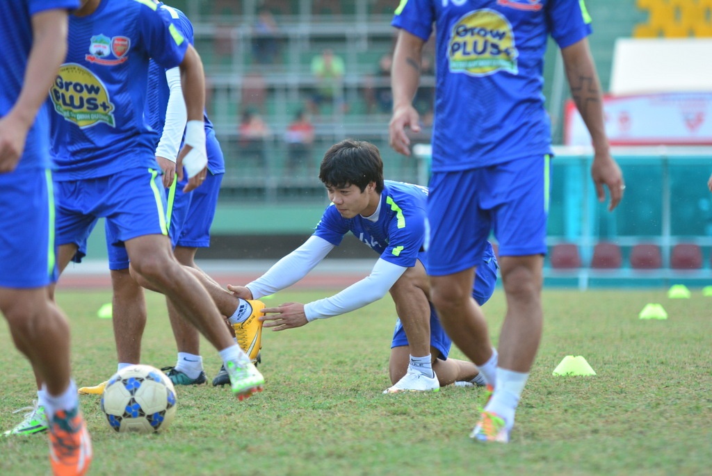 Khác với vẻ ngoài lạnh lùng thường thấy, Công Phượng luôn tươi cười, pha trò, thậm chí "chơi khăm" các đồng đội tại HAGL trong buổi tập chiều 6/2 trên sân Cần Thơ.