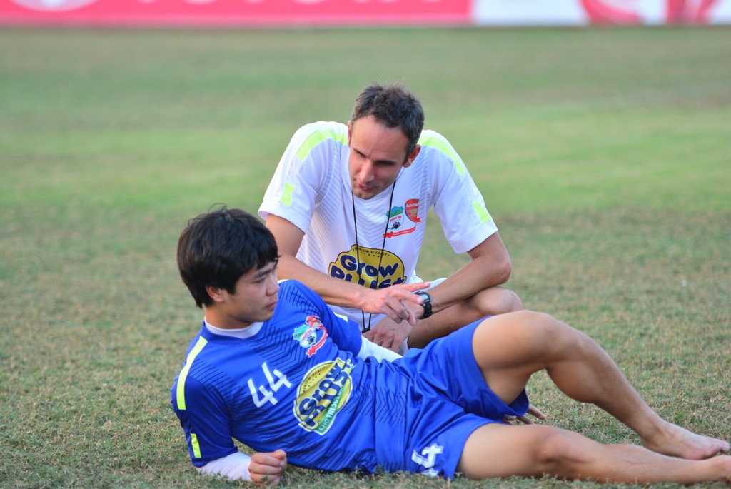 | Công Phượng trao đổi với HLV thể lực Anthony Debant sau trận đấu. |