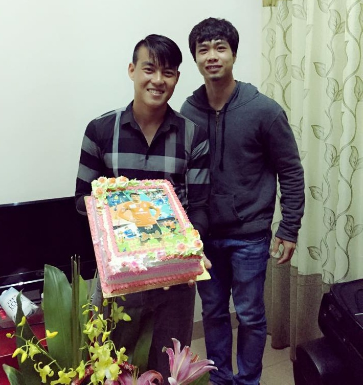 | Trong bữa tiệc sinh nhật, Công Phượng tinh nghịch đứng lên ghế để chụp ảnh cùng đàn anh cao hơn mình gần 20 cm. Công Phượng chỉ có chiều cao 1,68 m, trong khi trung vệ Hoàng Lâm là người cao nhất Olympic Việt Nam (1,86 m). |