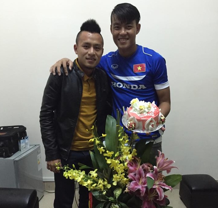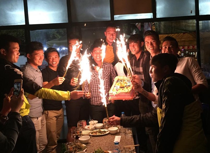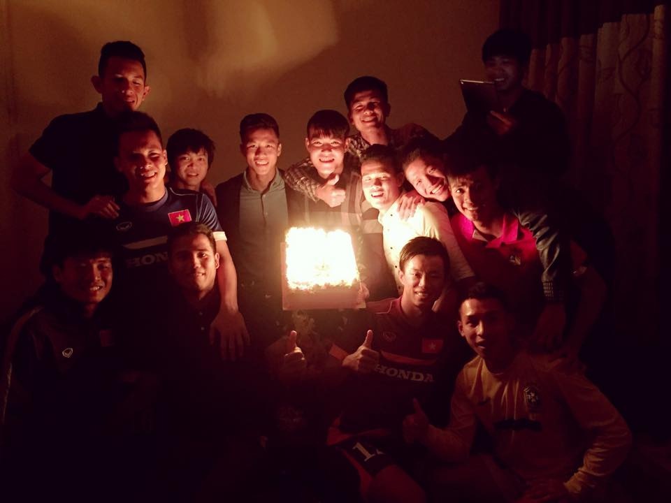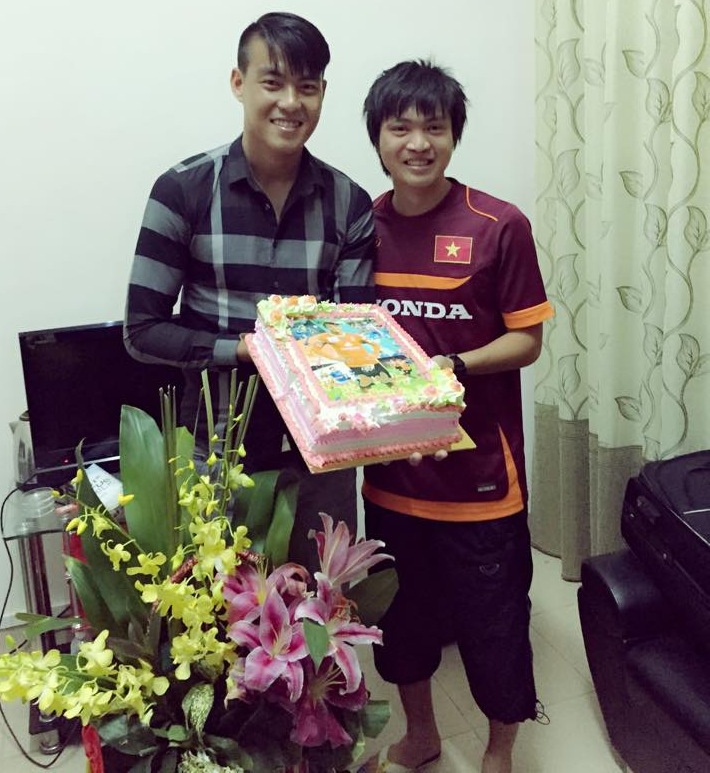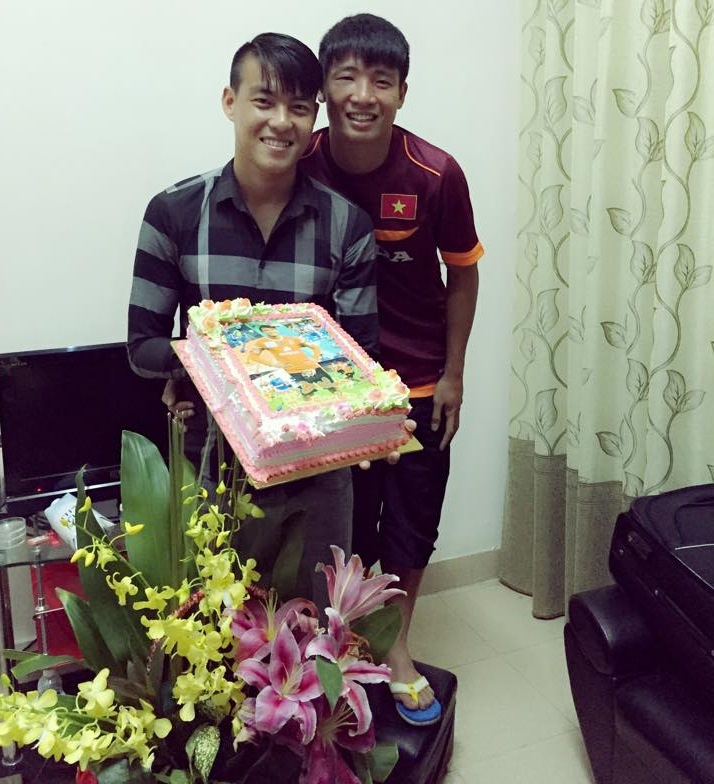 | Tiền đạo mang áo số 10 vẫn tinh nghịch đứng trên ghế để "gian lận" chiều cao, trong khi cả nhóm đứng chụp ảnh lưu niệm cùng nến và bánh sinh nhật. Hồi tháng 8/2014, Công Phượng cũng nhờ thủ môn Minh Long bế bổng lên khi chụp ảnh tại Đại sứ quán Việt Nam tại Brunei. |