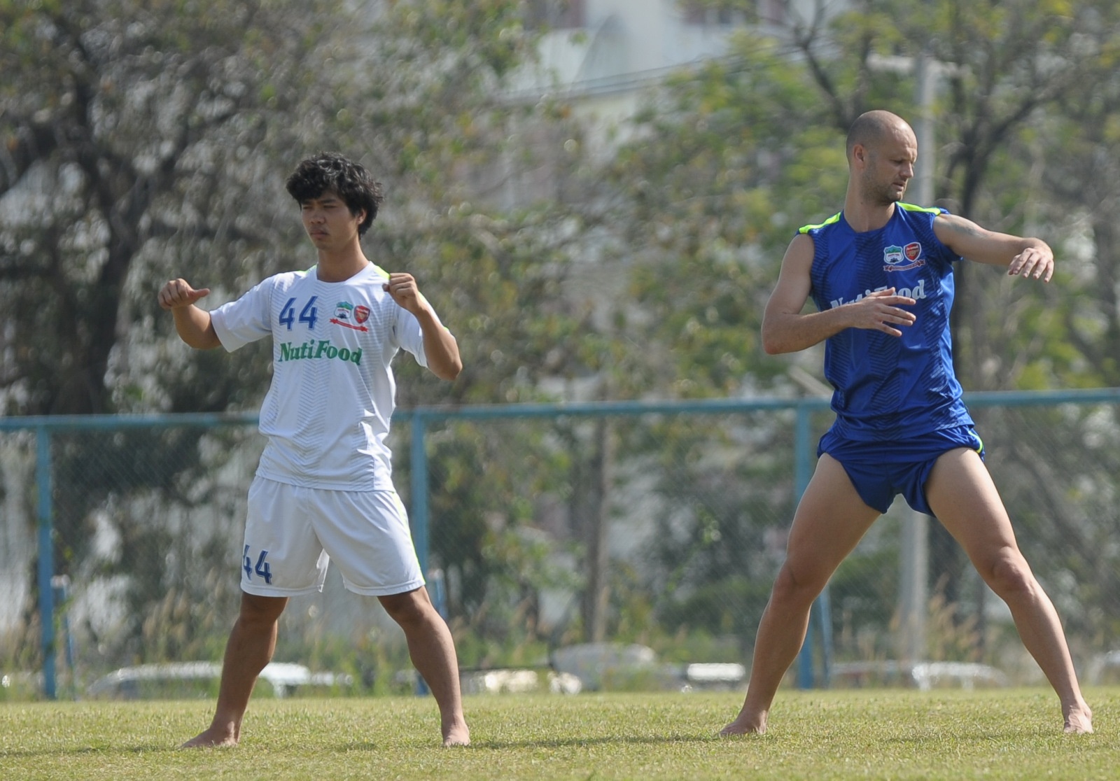| Sau đó các cầu thủ được BHL cho phép tự do chơi đùa với bóng để duy trì cảm giác. Công Phượng cùng đàn anh Hoàng Thiên ngẫu hứng tâng bóng qua lại bằng chân đất. |