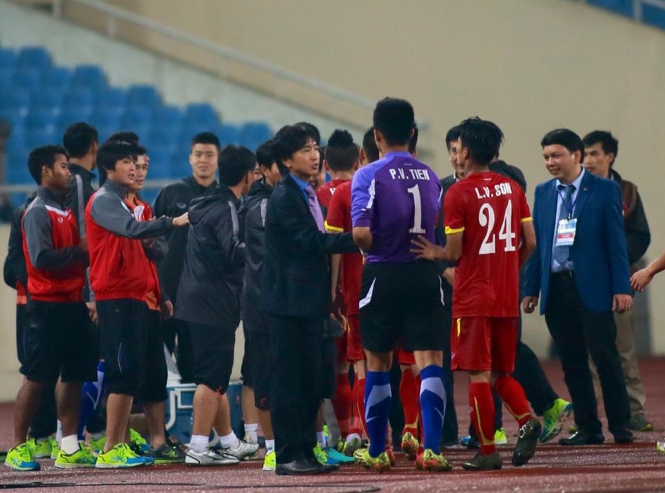 | HLV Miura đứng ngồi không yên trong suốt 90 phút, tuy nhiên chiến thắng chung cuộc 1-0 trước Olympic Indonesia đã phần nào giải tỏa áp lực của HLV người Nhật Bản. |