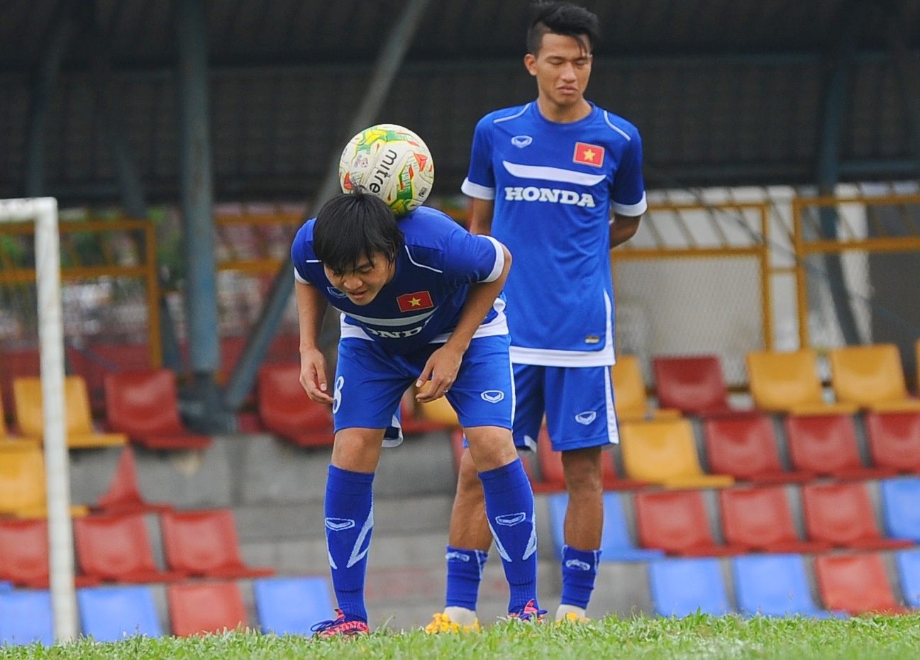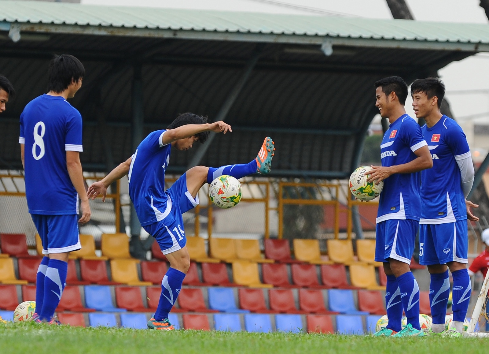 | Được đào tạo bài bản tại lò HAGL Arsenal-JMG, hai cầu thủ này đã gần như hoàn thiện về kỹ thuật, chơi bóng thanh thoát. Trong ảnh, Công Phượng ngẫu hứng biểu diễn trước sự thán phục của đồng đội. |