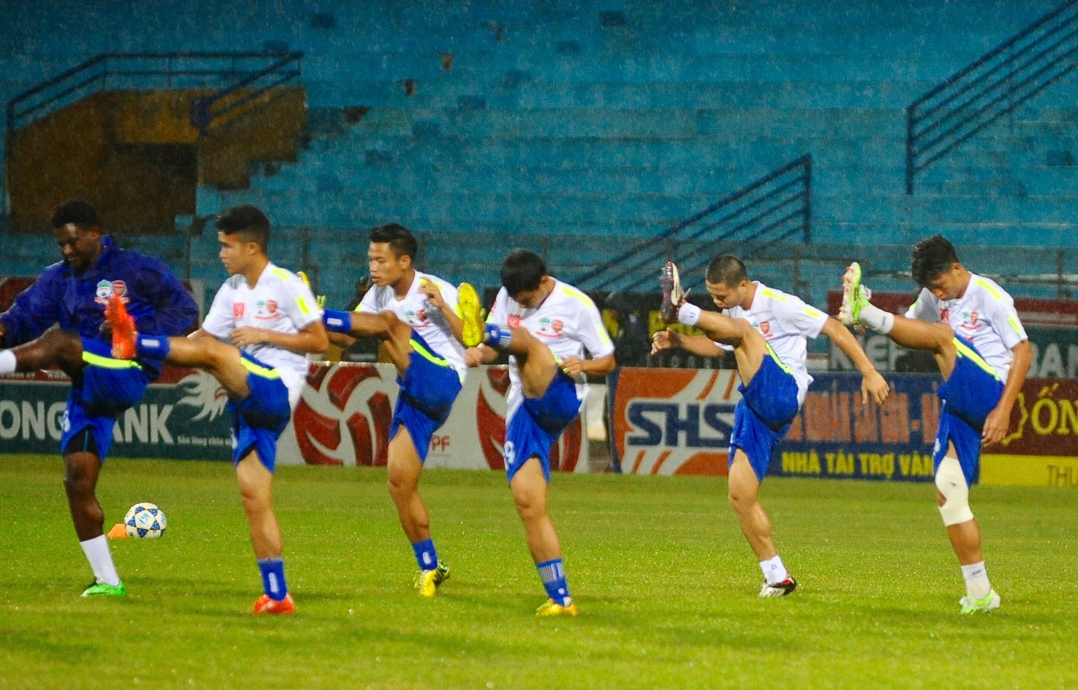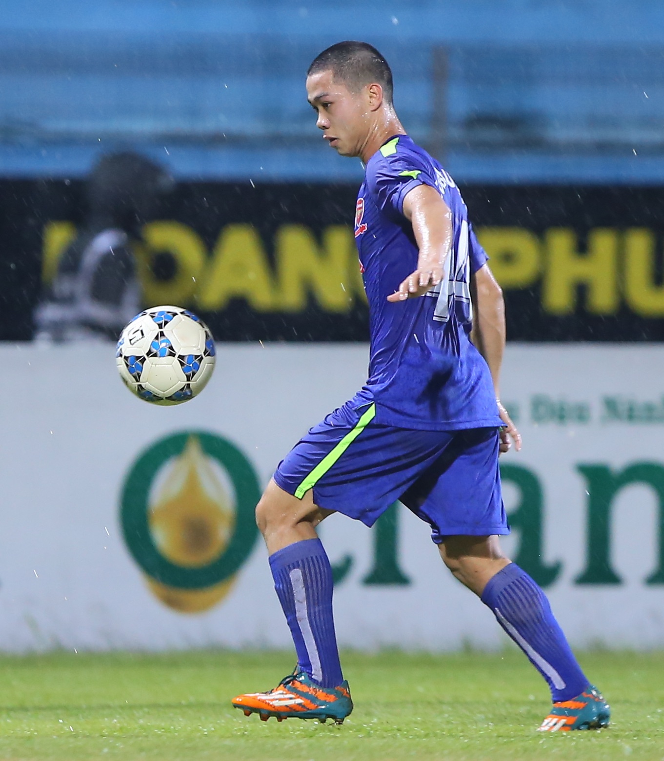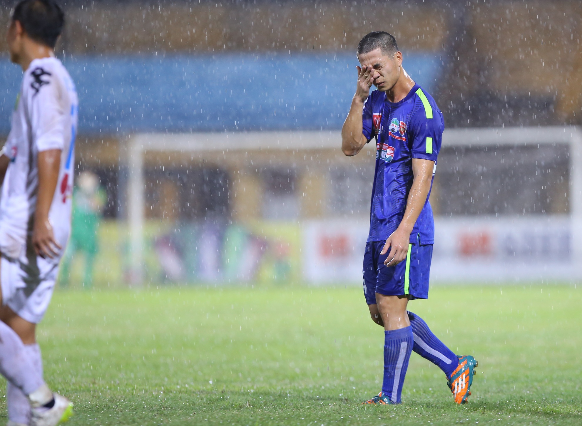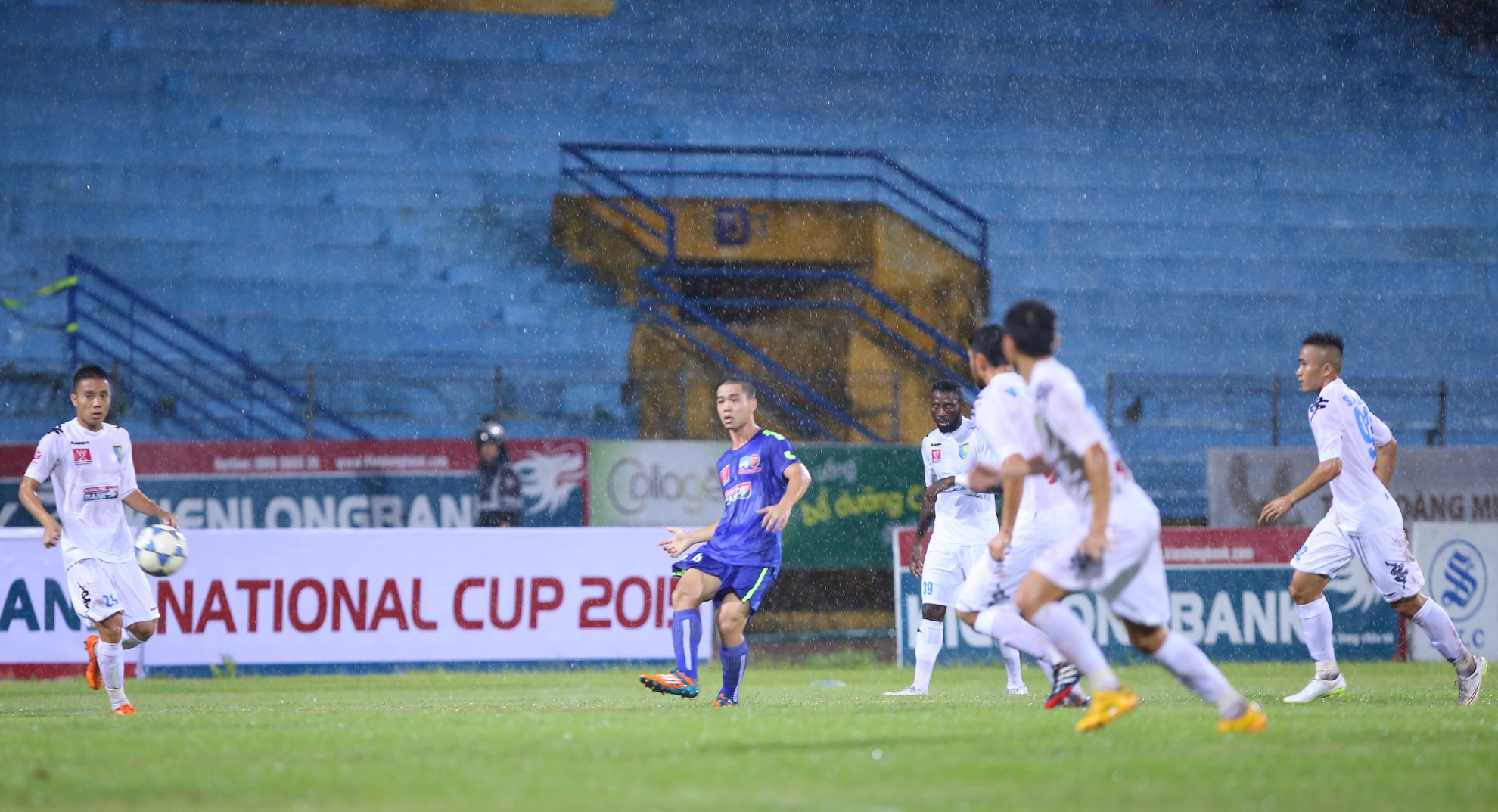 | Cựu đội trưởng U19 Việt Nam bị theo sát bởi 4-5 cầu thủ Hà Nội T&T trong điều kiện mặt sơn trơn trượt và mặt cỏ đọng nhiều nước. |