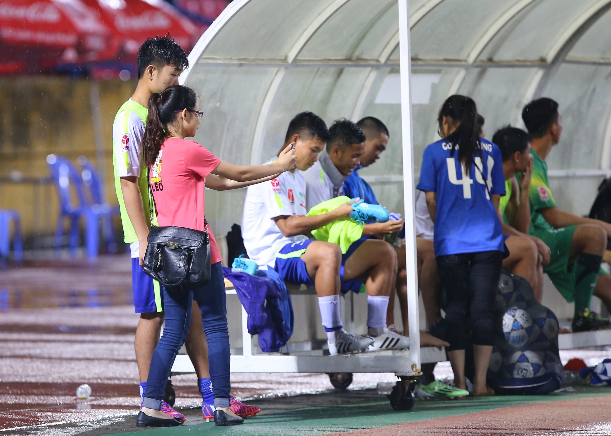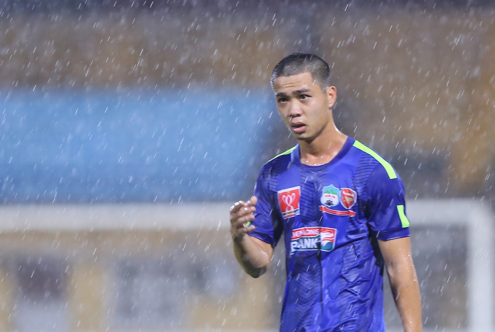 | Thời tiết Hà Nội mưa lớn do ảnh hưởng của bão số 1, hơn 1.000 khán giả có mặt trên sân Hàng Đẫy ồ lên ngạc nhiên khi Công Phượng ra sân đá chính với kiểu tóc ngắn khác biệt. |