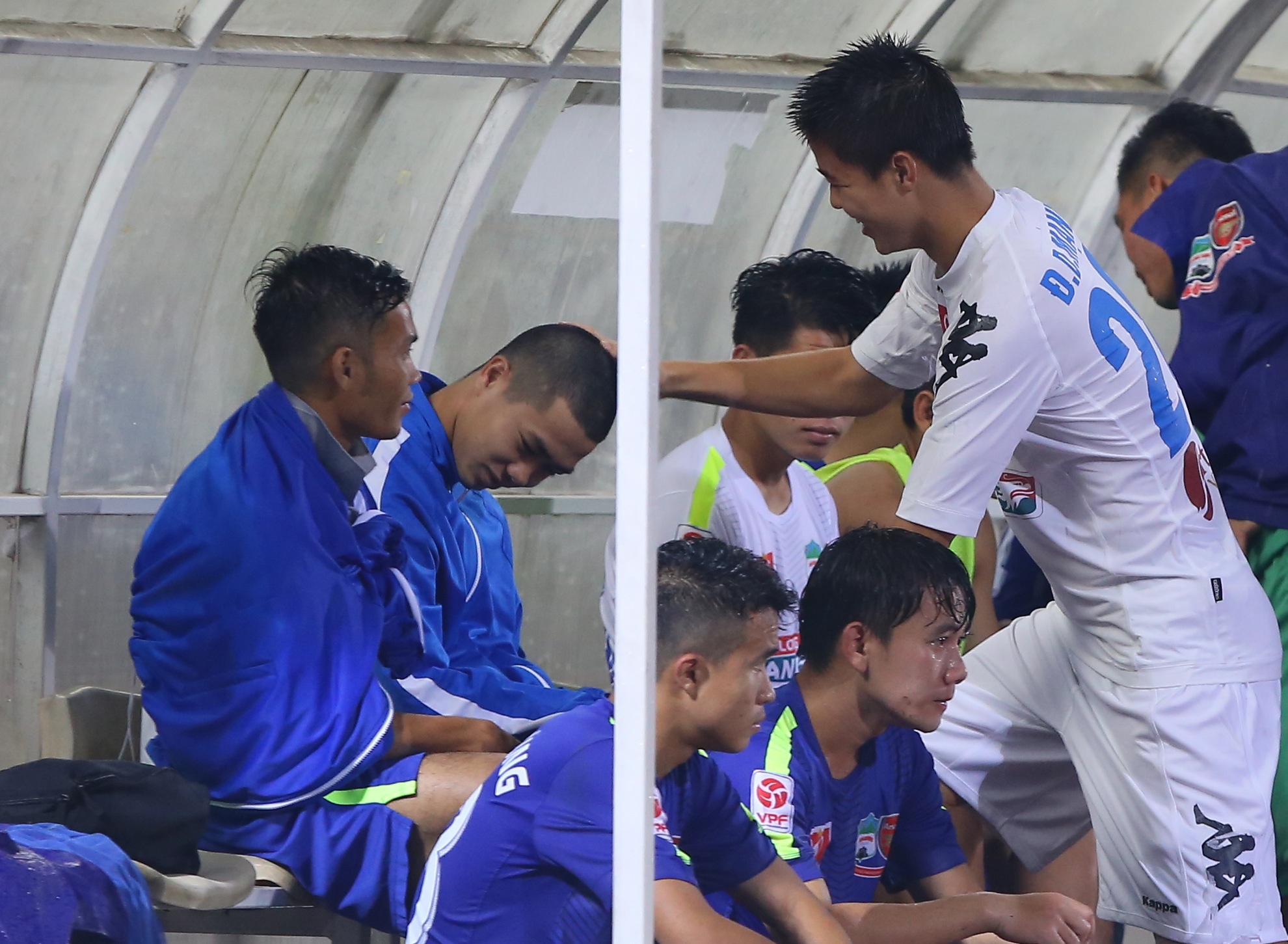 | Khi Công Phượng rời lên băng ghế huấn luyện nghỉ ngơi, Duy Mạnh - đồng đội trong màu áo U19 và U23 Việt Nam chạy tới hỏi thăm kiểu đầu mới của Công Phượng. |