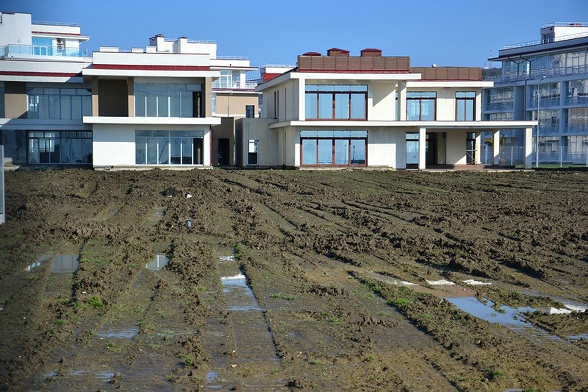 Nước đọng lênh láng trên đường, xa xa là những công trình tiền tỷ bỏ hoang.