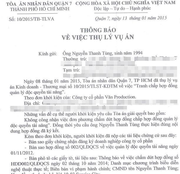 Hiện tại, tòa án nhân dân quận 7, TP.HCM đã thụ lý hồ sơ vụ kiện của công ty Văn Production với Sơn Tùng. Tòa cũng gửi thông báo đến nam ca sĩ Nguyễn Thanh Tùng biết, trong thời hạn 15 ngày, kể từ ngày nhận được thông báo thụ lý hồ sơ từ tòa án, anh phải có phản hồi đến tòa. Nếu không có ý kiến đối với yêu cầu khởi kiện, tòa án sẽ căn cứ vào tài liệu, chứng cứ có trong hồ sơ để giải quyết vụ án theo quy định của pháp luật.