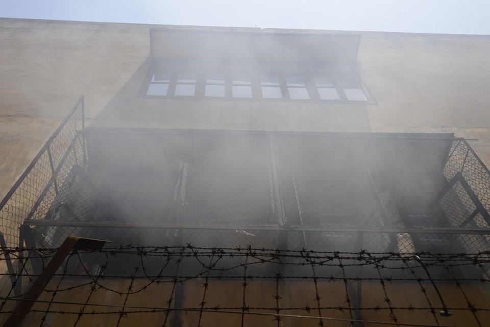 | Cảnh sát PCCC phá hàng rào gai thép để tiếp cận, sử dụng vòi rồng phun nước khống chế cháy lan. |