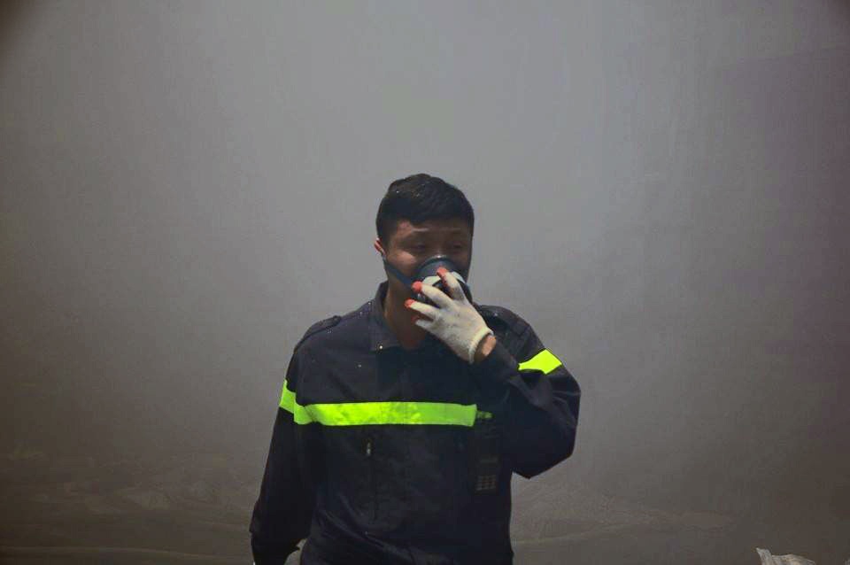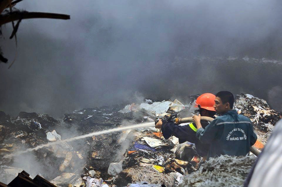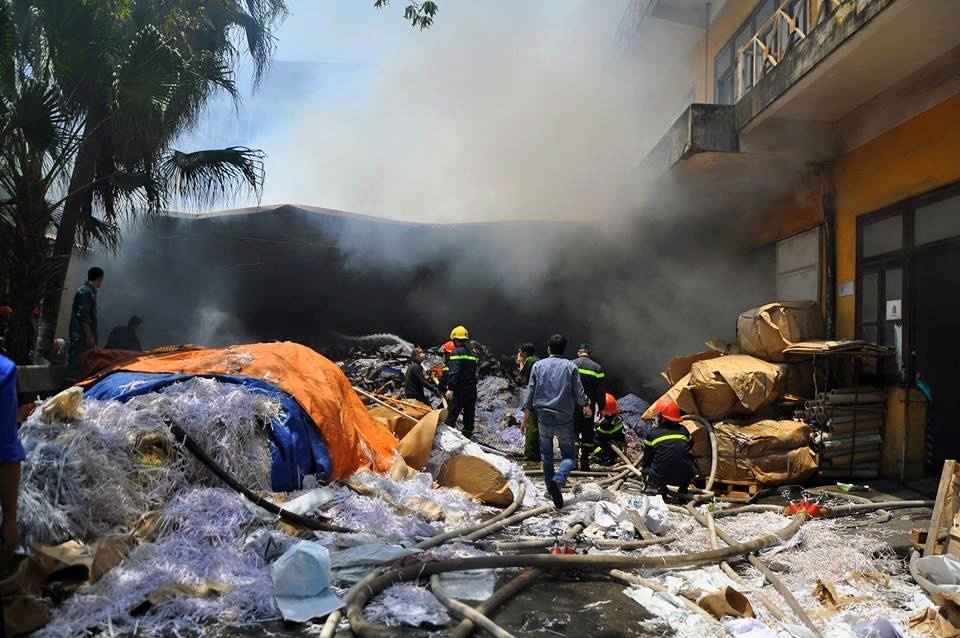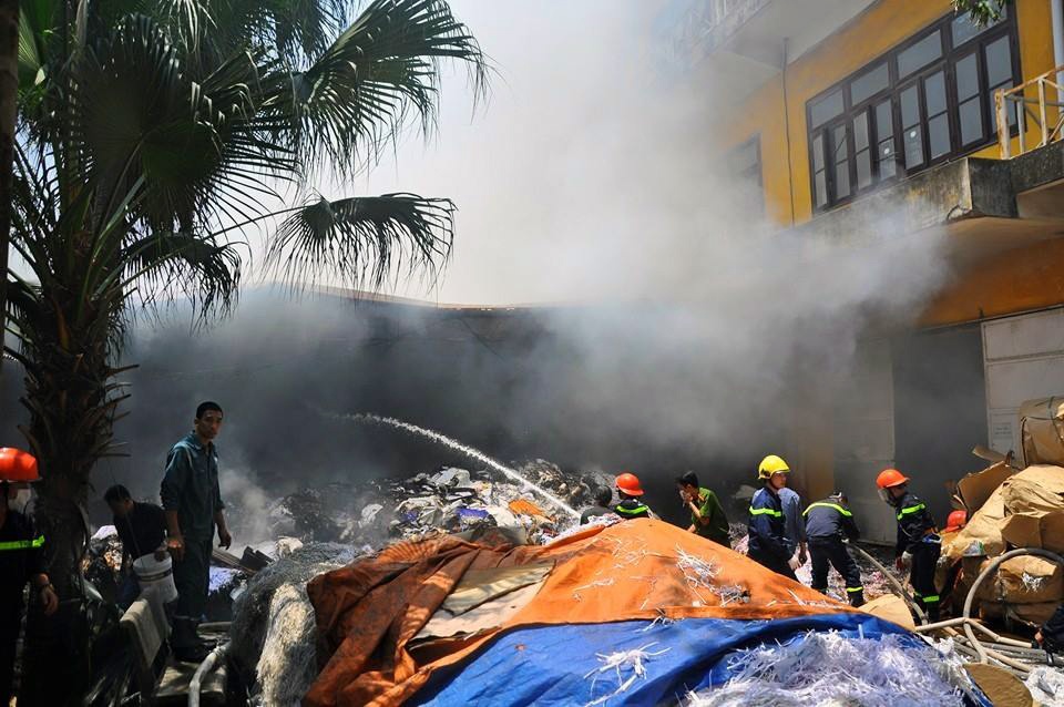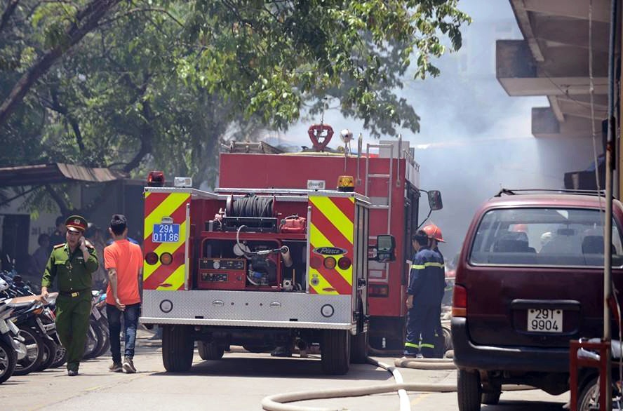 | Ghi nhận tại hiện trường, vụ hỏa hoạn với cột khói đen bốc cao lan sang toàn bộ không gian công ty và khu dân cư ngõ 80 Ngụy Như Kon Tum gần đó. Cảnh sát phải sử dụng mặt nạ chống độc để vào hiện trường và liên tục thay phiên nhau dập lửa. |