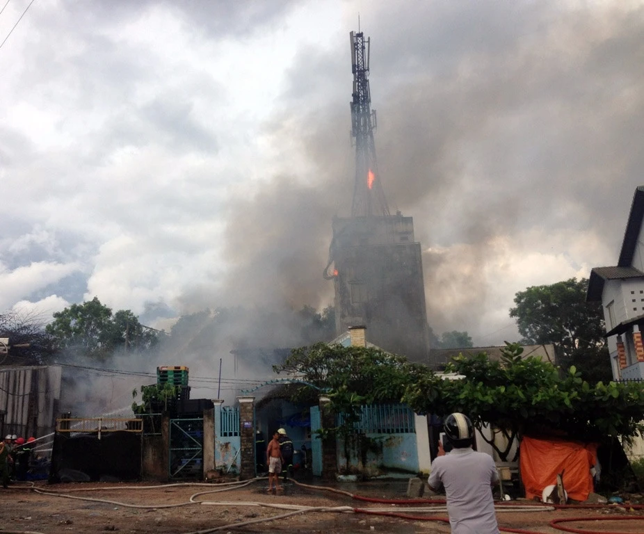 | Hiện trường vụ cháy kho pallet nhựa tại công ty Trung Tuyền và lan đến trạm phát sóng di động. |
