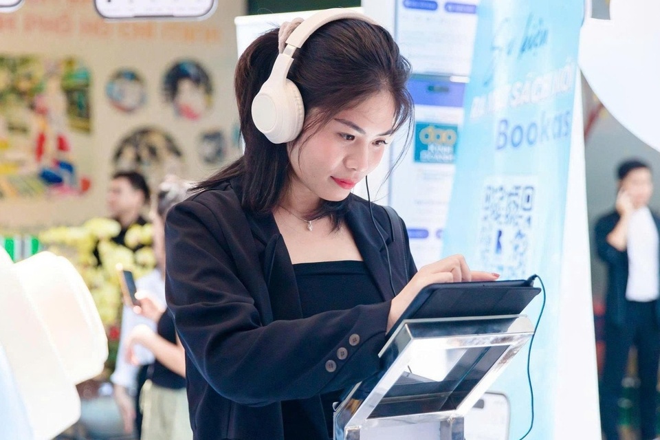 Độc giả trải nghiệm sách nói ở TP.HCM. Ảnh: Tâm Anh. |